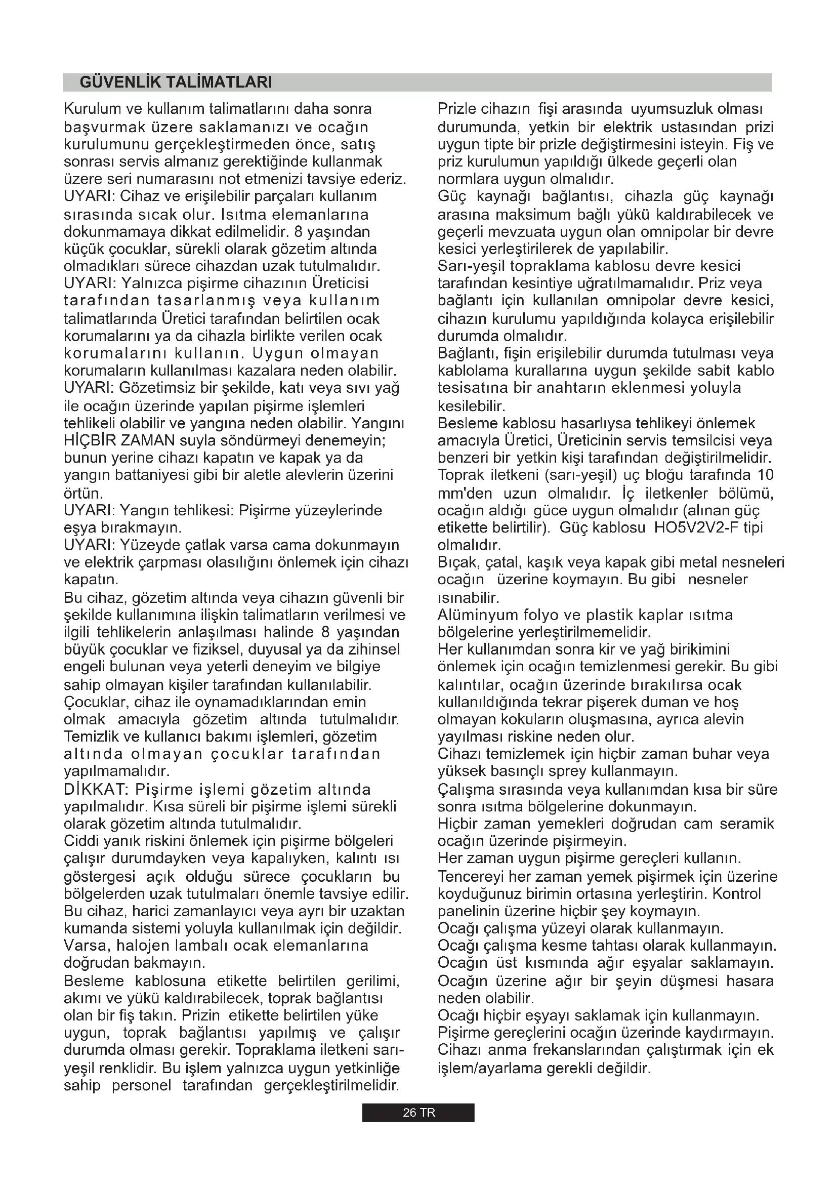 Ünitenin dışına yerleştirilmiş olan değer plakasındaki verilerin, güç kaynağı ve giriş voltajı değerlerine uygun olduğunu kontrol edin. Bağlantı öncesinde, topraklama sistemini kontrol edin. Kanun gereğince, bu cihaz topraklanmalıdır. Bu düzenlemeye uyulmadığı taktirde, Üretici kişilere veya mülkiyete verilecek zararlardan sorumlu olmayacaktır. Fiş henüz takılmadıysa, değer plakasında gösterilen yüke uygun bir fiş takınız. Topraklama teli sarı/yeşil renklidir. Fiş her zaman erişilebilir durumda olmalıdır. Ocağın doğrudan bir elektrik kaynağına bağlandığı yerde, bir devre kesicisi (şalter) tesis edilmelidir. Güç kaynağı kablosu zarar görürse, potansiyel bir riski önlemek için ehliyetli bir mühendis tarafından değiştirilmelidir. Topraklama kablosu (yeşil veya sarı renkli) aktif ve nötr kablolardan en az 10 mm daha uzun olmalıdır. Kullanılan kablo bölümü, ocağın çektiği elektriğe göre uygun ölçülerde olmalıdır. Lütfen güç bilgileri için değer plakasını kontrol edin ve güç kaynağı kablosunun 3x0.75 mm² H05 V2V2-F, tipinde olmasını sağlayın. AKTİF TOPRAK NOTR