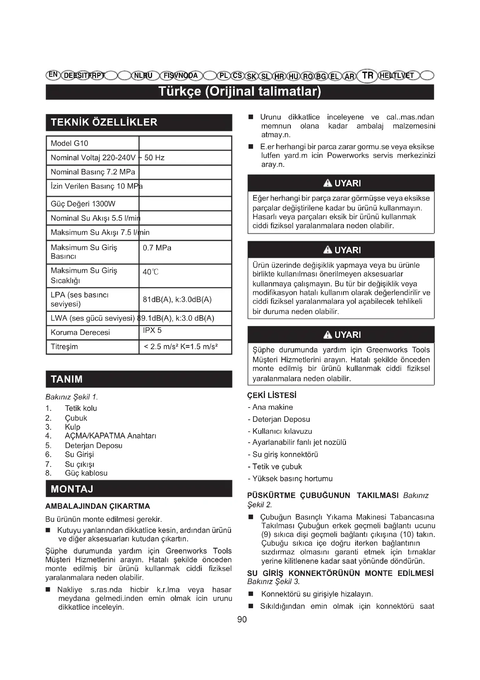MONTAJ AMBALAJINDAN ÇIKARTMA Bu ürünün monte edilmesi gerekir. Kutuyu yanlarından dikkatlice kesin, ardından ürünü ve diğer aksesuarları kutudan çıkartın. Şüphe durumunda yardım için Greenworks Tools Müşteri Hizmetlerini arayın. Hatalı şekilde önceden monte edilmiş bir ürünü kullanmak ciddi fiziksel yaralanmalara neden olabilir. Nakliye s.ras.nda hicbir k.r.lma veya hasar meydana gelmedi.inden emin olmak icin urunu dikkatlice inceleyin. Urunu dikkatlice inceleyene ve cal..mas.ndan memnun olana kadar ambalaj malzemesini atmay.n. E.er herhangi bir parca zarar gormu.se veya eksikse lutfen yard.m icin Powerworks servis merkezinizi aray.n. UYARI Eğer herhangi bir parça zarar görmüşse veya eksikse parçalar değiştirilene kadar bu ürünü kullanmayın. Hasarlı veya parçaları eksik bir ürünü kullanmak ciddi fiziksel yaralanmalara neden olabilir. UYARI Ürün üzerinde değişiklik yapmaya veya bu ürünle birlikte kullanılması önerilmeyen aksesuarlar kullanmaya çalışmayın. Bu tür bir değişiklik veya modifikasyon hatalı kullanım olarak değerlendirilir ve ciddi fiziksel yaralanmalara yol açabilecek tehlikeli bir duruma neden olabilir. UYARI Şüphe durumunda yardım için Greenworks Tools Müşteri Hizmetlerini arayın. Hatalı şekilde önceden monte edilmiş bir ürünü kullanmak ciddi fiziksel yaralanmalara neden olabilir.