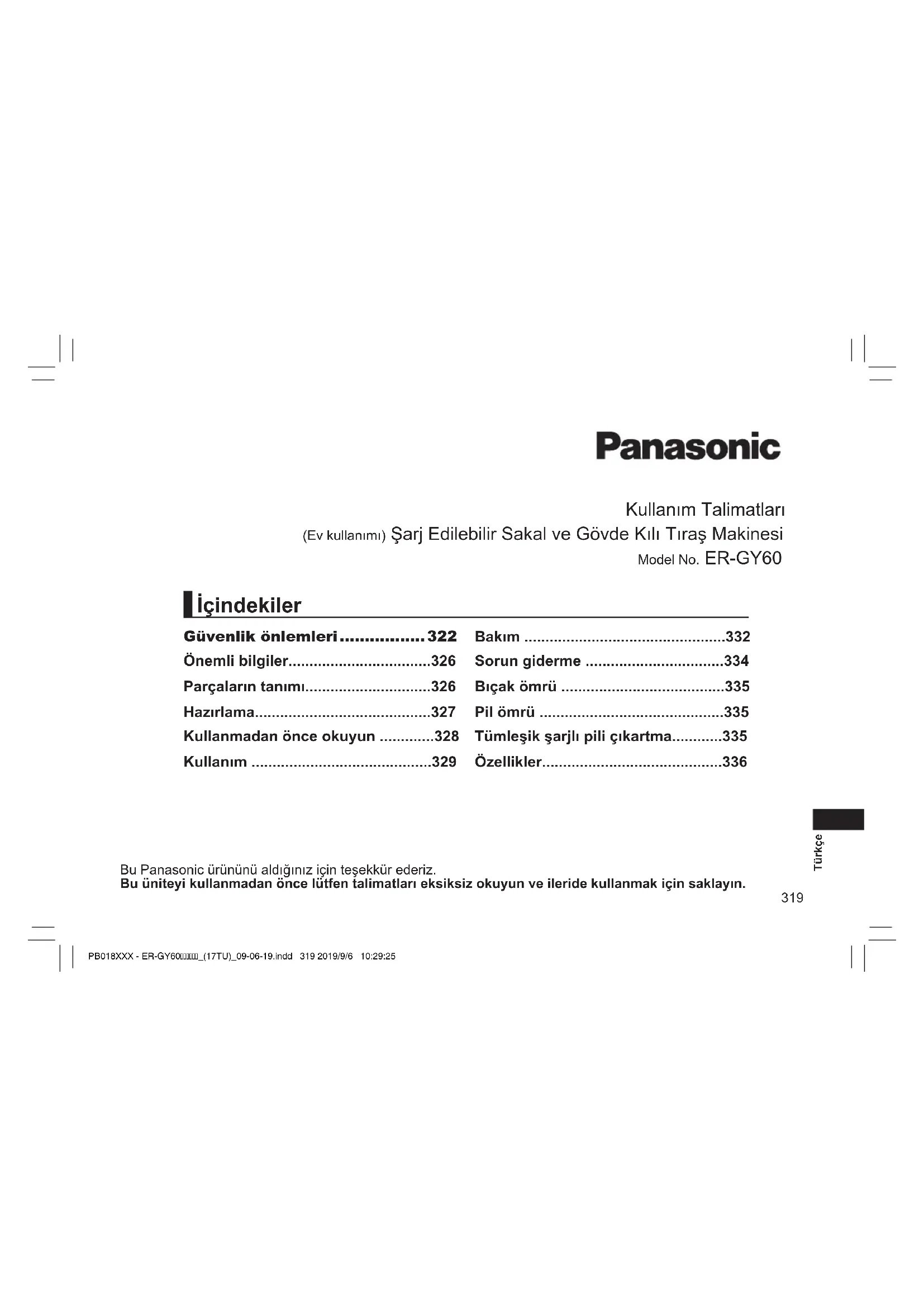 PB018XXX - ER-GY60_(17TU)_09-06-19.indd 336 2019/9/6 10:29:39337 Türkçe AEEE Yönetmeliğine Uygundur. Eski Ekipman ve Bataryaların İşlenmesi. Sadece geri dönüşüm sistemleri olan Avrupa Birliği ve ülkeleri için geçerlidir. Ürünler, ambalaj ve/veya ekli belgeler üzerindeki bu semboller kullanılmış elektrik ve elektronik ürünlerin ve pillerin genel ev atığı ile karıştırılmaması gerektiğini ifade eder. Eski ürünlerin ve pillerin toplanması ve geri kazanılması için bu atıkları lütfen yasayla belirlenmiş olan uygun toplama merkezlerine teslim ediniz. Bu atıkların doğru işlenmesiyle, değerli kaynakların korunmasına ve insan sağlığı ve çevreye olası negatif etkilerinin engellenmesine yardımcı olabilirsiniz. Atıkların toplanması ve geri dönüşümü için detaylı bilgi için lütfen bağlı olduğunuz yerel yönetimlerle iletişime geçiniz. Atıkların atılmasıyla ilgili yanlış uygulamalar yasayla belirlenmiş olan cezalara sebebiyet verebilir. PB018XXX - ER-GY60_(17TU)_09-06-19.indd 337 2019/9/6 10:29:40338 MEMO PB018XXX - ER-GY60_(17TU)_09-06-19.indd 338 2019/9/6 10:29:40339 MEMO PB018XXX - ER-GY60_(17TU)_09-06-19.indd 339 2019/9/6 10:29:40Panasonic Corporation http://www.panasonic.com