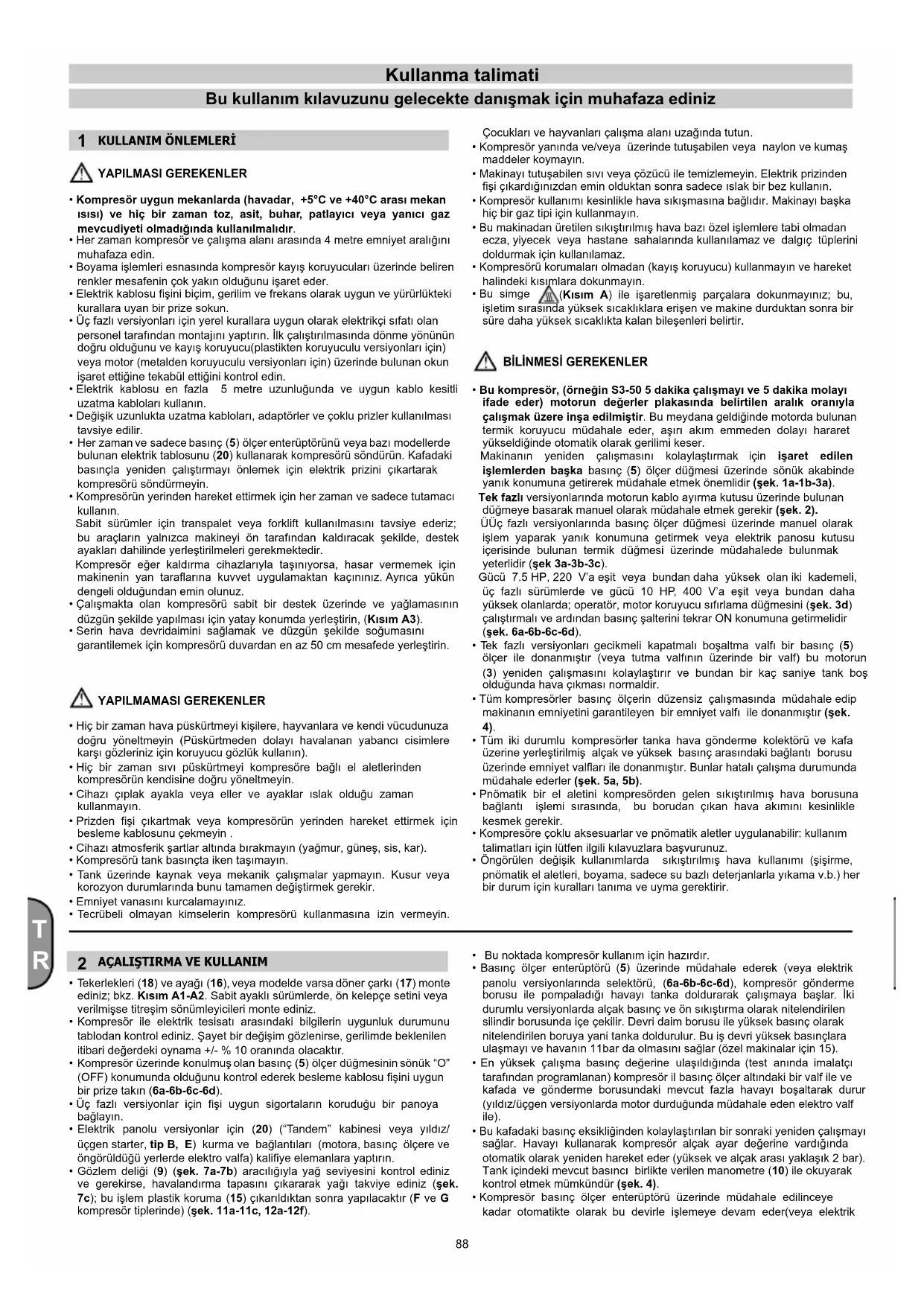 - Tecrübeli olmayan kimselerin kompresörü kullanmasına izin vermeyin. Çocukları ve hayvanları çalışma alanı uzağında tutun.• Kompresör yanında ve/veya üzerinde tutuşabilen veya naylon ve kumaş maddeler koymayın.• Makinayı tutuşabilen sıvı veya çözücü ile temizlemeyin. Elektrik prizinden fişi çıkardığınızdan emin olduktan sonra sadece ıslak bir bez kullanın. • Kompresör kullanımı kesinlikle hava sıkışmasına bağlıdır. Makinayı başka hiç bir gaz tipi için kullanmayın.• Bu makinadan üretilen sıkıştırılmış hava bazı özel işlemlere tabi olmadan ecza, yiyecek veya hastane sahalarında kullanılamaz ve dalgıç tüplerini doldurmak için kullanılamaz.• Kompresörü korumaları olmadan (kayış koruyucu) kullanmayın ve hareket halindeki kısımlara dokunmayın.• Bu simge (Kısım A) ile işaretlenmiş parçalara dokunmayınız; bu, işletim sırasında yüksek sıcaklıklara erişen ve makine durduktan sonra bir süre daha yüksek sıcaklıkta kalan bileşenleri belirtir.