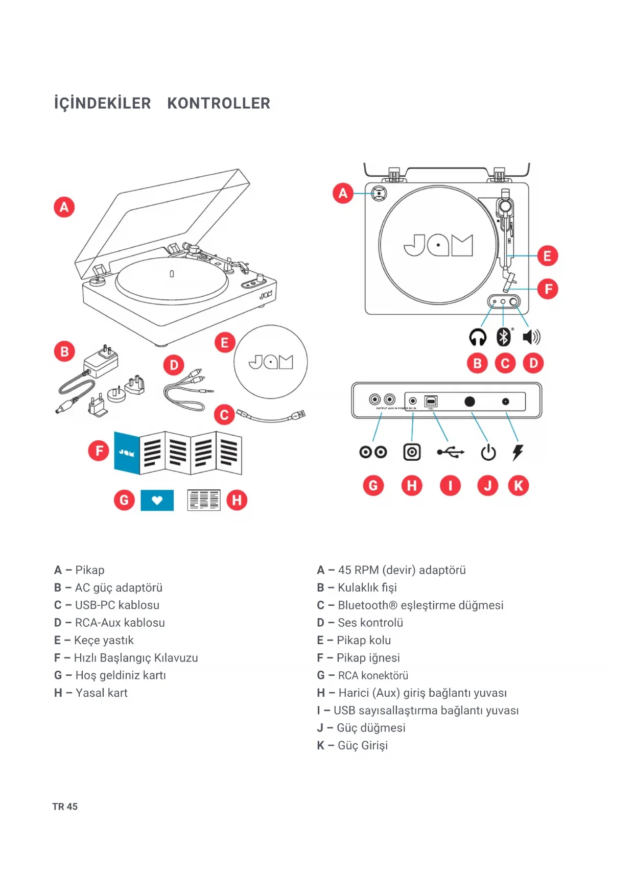 A – Pikap B – AC güç adaptörü C – USB-PC kablosu D – RCA-Aux kablosu E – Keçe yastık F – Hızlı Başlangıç Kılavuzu G – Hoş geldiniz kartı H – Yasal kart A – 45 RPM (devir) adaptörü B – Kulaklık şi C – Bluetooth® eşleştirme düğmesi D – Ses kontrolü E – Pikap kolu F – Pikap iğnesi G – RCA konektörü H – Harici (Aux) giriş bağlantı yuvası I – USB sayısallaştırma bağlantı yuvası J – Güç düğmesi K – Güç Girişi