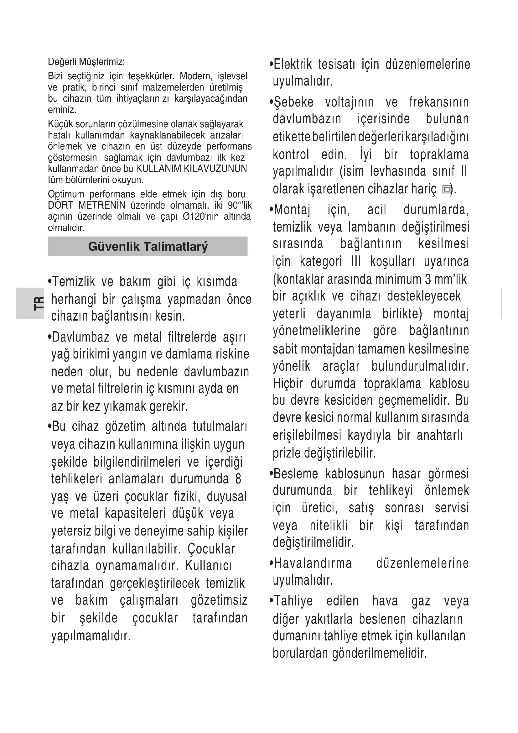 - Είναι πιθανό με την τοποθέτηση φίλτρων άνθρακα να παρατηρηθεί μείωση της ροής εξαγωγής στον απορροφητήρα.TR Değerli Müşterimiz: Bizi seçtiğiniz için teşekkürler. Modern, işlevsel ve pratik, birinci sınıf malzemelerden üretilmiş bu cihazın tüm ihtiyaçlarınızı karşılayacağından eminiz. Küçük sorunların çözülmesine olanak sağlayarak hatalı kullanımdan kaynaklanabilecek arızaları önlemek ve cihazın en üst düzeyde performans göstermesini sağlamak için davlumbazı ilk kez kullanmadan önce bu KULLANIM KILAVUZUNUN tüm bölümlerini okuyun. Optimum performans elde etmek için dış boru DÖRT METRENİN üzerinde olmamalı, iki 90°’lik açının üzerinde olmalı ve çapı Ø120’nin altında olmalıdır.