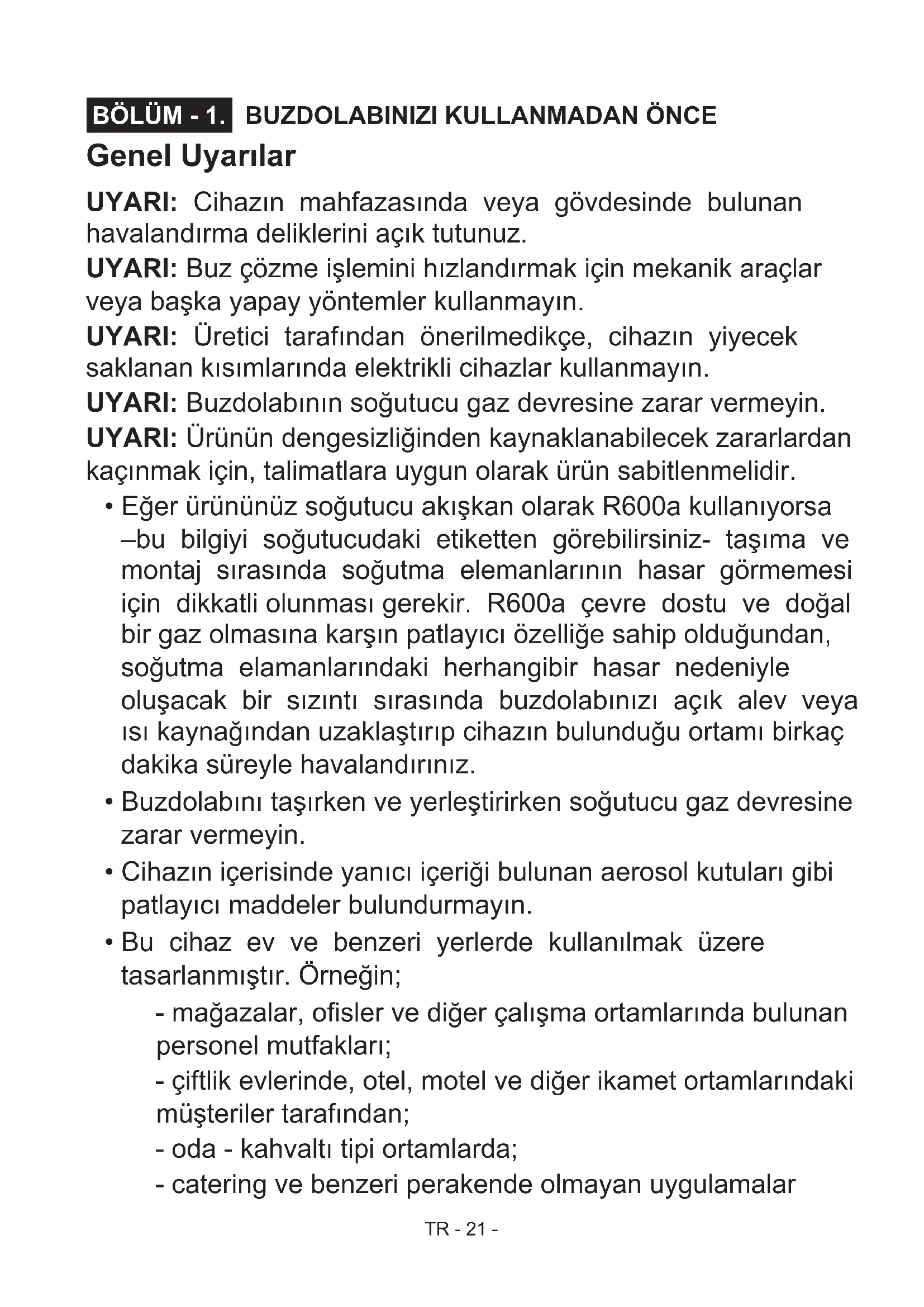 - Bu ürün evlerde kullanım için üretilmiş olup, yalnızca gıdaların soğutulması / muhafazası için uygundur. Ticari yada toplu kullanıma ve / veya gıda harici maddelerin muhafazasına uygun değildir. Aksi halde doğacak zararlardan şirketimiz sorumlu değildir. Güvenlik Uyarıları