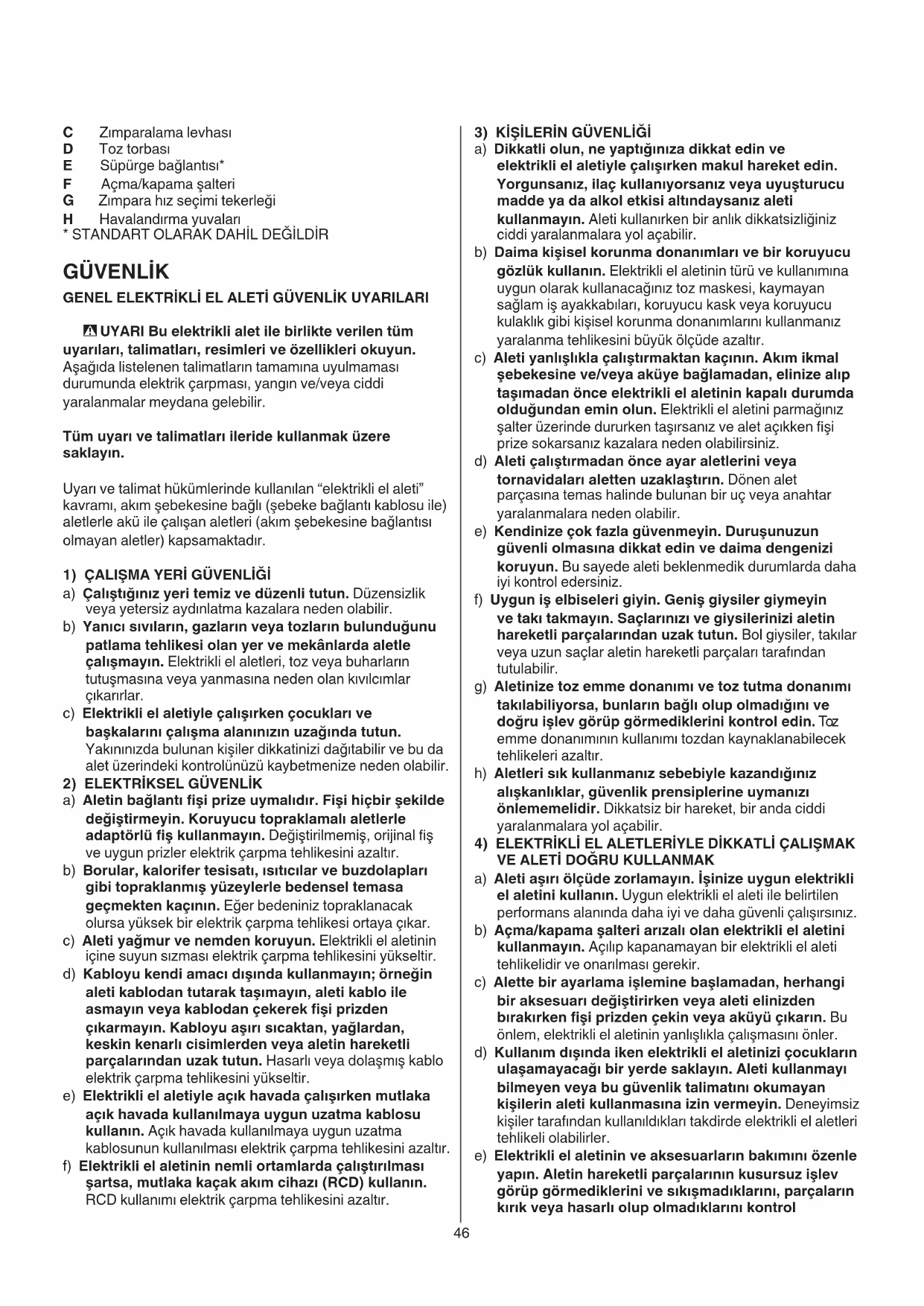 a) Aletin bağlantı şi prize uymalıdır. Fişi hiçbir şekilde değiştirmeyin. Koruyucu topraklamalı aletlerle adaptörlü ş kullanmayın. Değiştirilmemiş, orijinal ş ve uygun prizler elektrik çarpma tehlikesini azaltır. b) Borular, kalorifer tesisatı, ısıtıcılar ve buzdolapları gibi topraklanmış yüzeylerle bedensel temasa geçmekten kaçının. Eğer bedeniniz topraklanacak olursa yüksek bir elektrik çarpma tehlikesi ortaya çıkar. c) Aleti yağmur ve nemden koruyun. Elektrikli el aletinin içine suyun sızması elektrik çarpma tehlikesini yükseltir. d) Kabloyu kendi amacı dışında kullanmayın; örneğin aleti kablodan tutarak taşımayın, aleti kablo ile asmayın veya kablodan çekerek şi prizden çıkarmayın. Kabloyu aşırı sıcaktan, yağlardan, keskin kenarlı cisimlerden veya aletin hareketli parçalarından uzak tutun. Hasarlı veya dolaşmış kablo elektrik çarpma tehlikesini yükseltir. e) Elektrikli el aletiyle açık havada çalışırken mutlaka açık havada kullanılmaya uygun uzatma kablosu kullanın. Açık havada kullanılmaya uygun uzatma kablosunun kullanılması elektrik çarpma tehlikesini azaltır. f) Elektrikli el aletinin nemli ortamlarda çalıştırılması şartsa, mutlaka kaçak akım cihazı (RCD) kullanın. RCD kullanımı elektrik çarpma tehlikesini azaltır.47