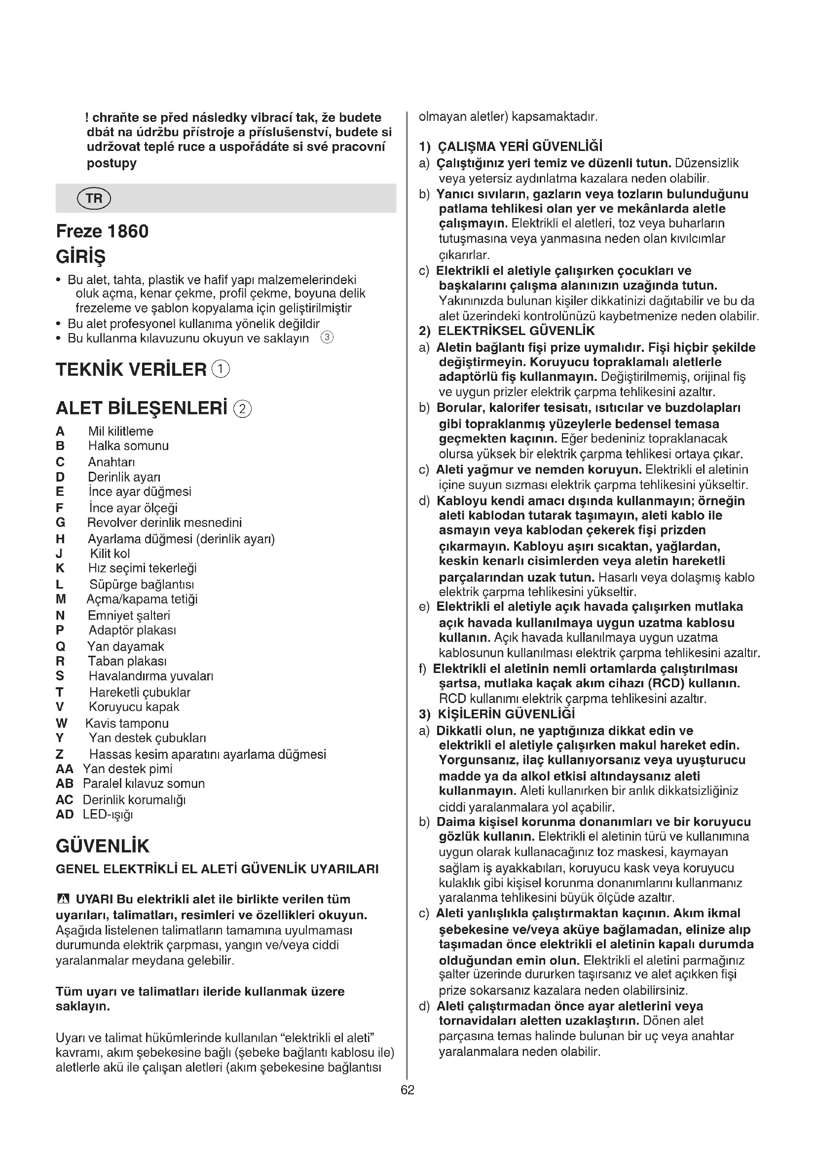 h) Aletleri sik kullanmaniz sebebycle kazandiginiz aliskanliklar, güvenlik prensiplerine uymaniz onlememelidir. Dikkatsiz bir hareket, biranda ciddi yaralanmalarayol acabilir.