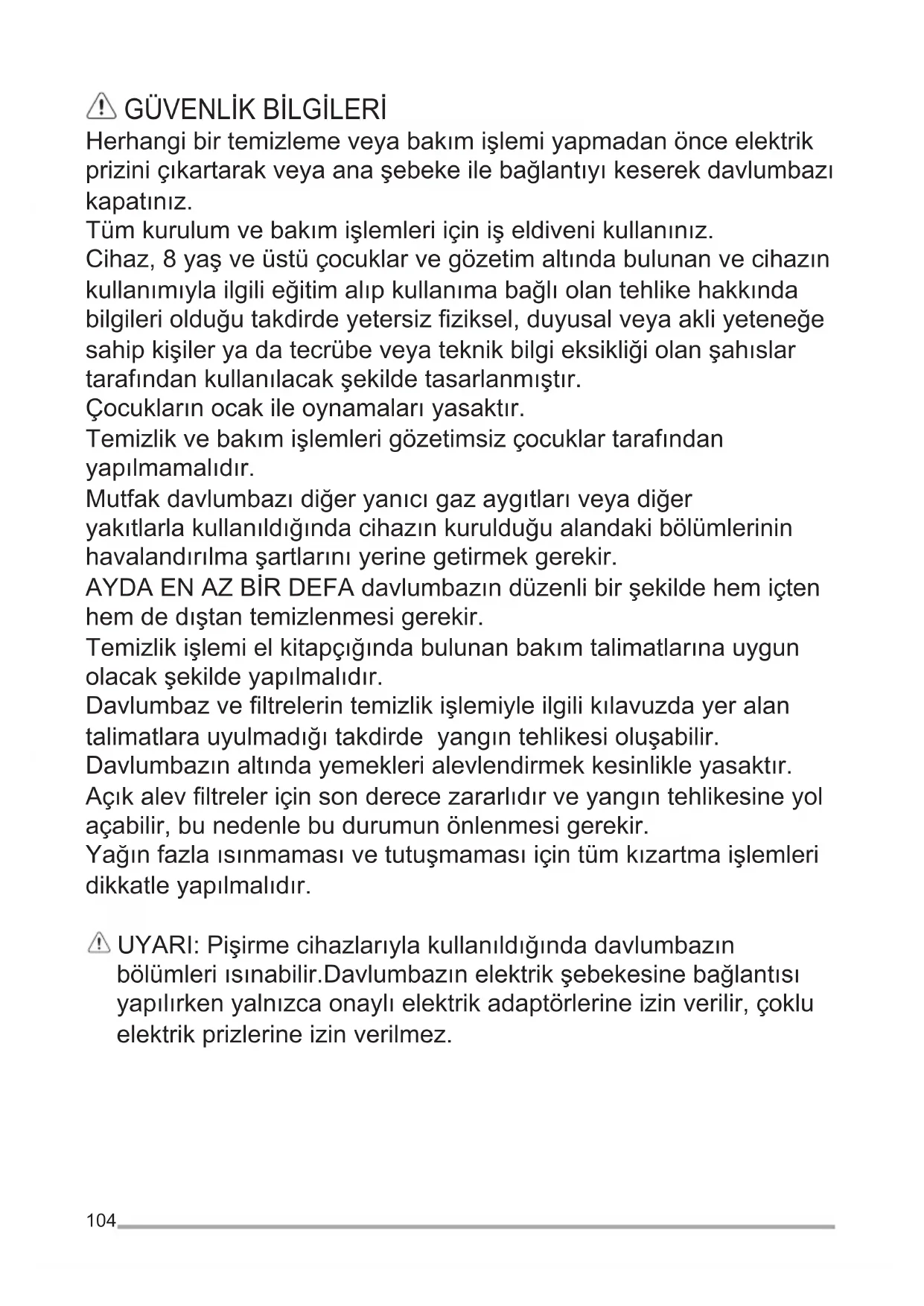 Herhangibirtemizlemeveyabakımişlemiyapmadanönceelektrik priziniçıkartarakveyaanaşebekeilebağlantıyıkeserekdavlumbazı kapatınız. Tümkurulumvebakımişlemleriiçinişeldivenikullanınız. Cihaz,8yaşveüstüçocuklarvegözetimaltındabulunanvecihazın kullanımıylailgilieğitimalıpkullanımabağlıolantehlikehakkında bilgileriolduğutakdirdeyetersizziksel,duyusalveyaakliyeteneğe sahipkişileryadatecrübeveyateknikbilgieksikliğiolanşahıslar tarafındankullanılacakşekildetasarlanmıştır. Çocuklarınocakileoynamalarıyasaktır. Temizlikvebakımişlemlerigözetimsizçocuklartarafından yapılmamalıdır. Mutfakdavlumbazıdiğeryanıcıgazaygıtlarıveyadiğer yakıtlarlakullanıldığındacihazınkurulduğualandakibölümlerinin havalandırılmaşartlarınıyerinegetirmekgerekir. AYDAENAZBİRDEFAdavlumbazındüzenlibirşekildehemiçten hemdedıştantemizlenmesigerekir. Temizlikişlemielkitapçığındabulunanbakımtalimatlarınauygun olacakşekildeyapılmalıdır. Davlumbazveltrelerintemizlikişlemiyleilgilikılavuzdayeralan talimatlarauyulmadığıtakdirdeyangıntehlikesioluşabilir. Davlumbazınaltındayemeklerialevlendirmekkesinlikleyasaktır. Açıkalevltreleriçinsonderecezararlıdırveyangıntehlikesineyol açabilir,bunedenlebudurumunönlenmesigerekir. Yağınfazlaısınmamasıvetutuşmamasıiçintümkızartmaişlemleri dikkatleyapılmalıdır. UYARI:Pişirmecihazlarıylakullanıldığındadavlumbazın bölümleriısınabilir.Davlumbazınelektrikşebekesinebağlantısı yapılırkenyalnızcaonaylıelektrikadaptörlerineizinverilir,çoklu elektrikprizlerineizinverilmez.105