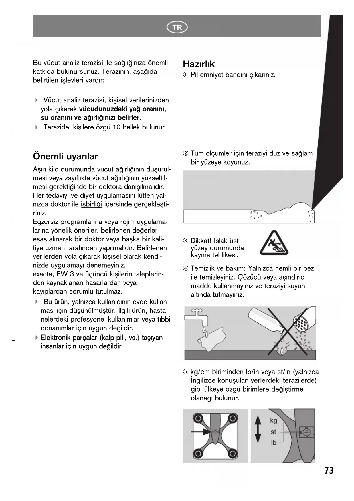 ④ Temizlik ve bakim: Yalnizca nemli bir bez ile temizleyiniz. Çozücu veya asindirici madde kullanmayiniz ve teraziyi suyun.altinda tutmayiniz.