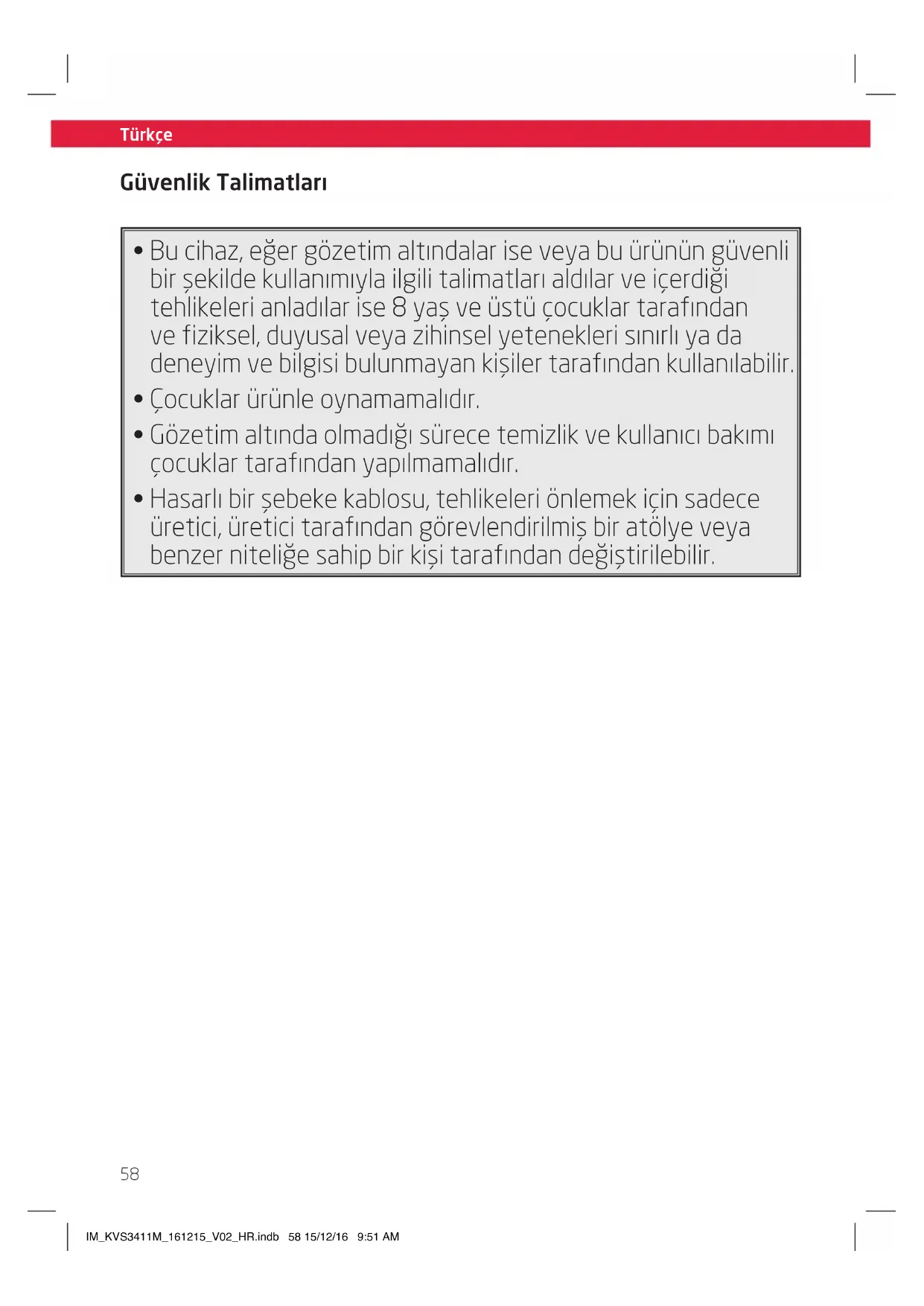 - Bu cihaz, eger gozetim altindalar ise veya bu urunun guvenli bir sekilde kullanimiyla ilgili talimatlar aldilar ve icerdigi tehlikeleri anladilar ise 8 yaş ve üstü;cocuklar tarafindan ve fiziksel, duyusal veya zihinsel yetenekleri sinirli ya da deneyim ve bilgisi bulunmayan kişiler tarafindan kullanilabilir.