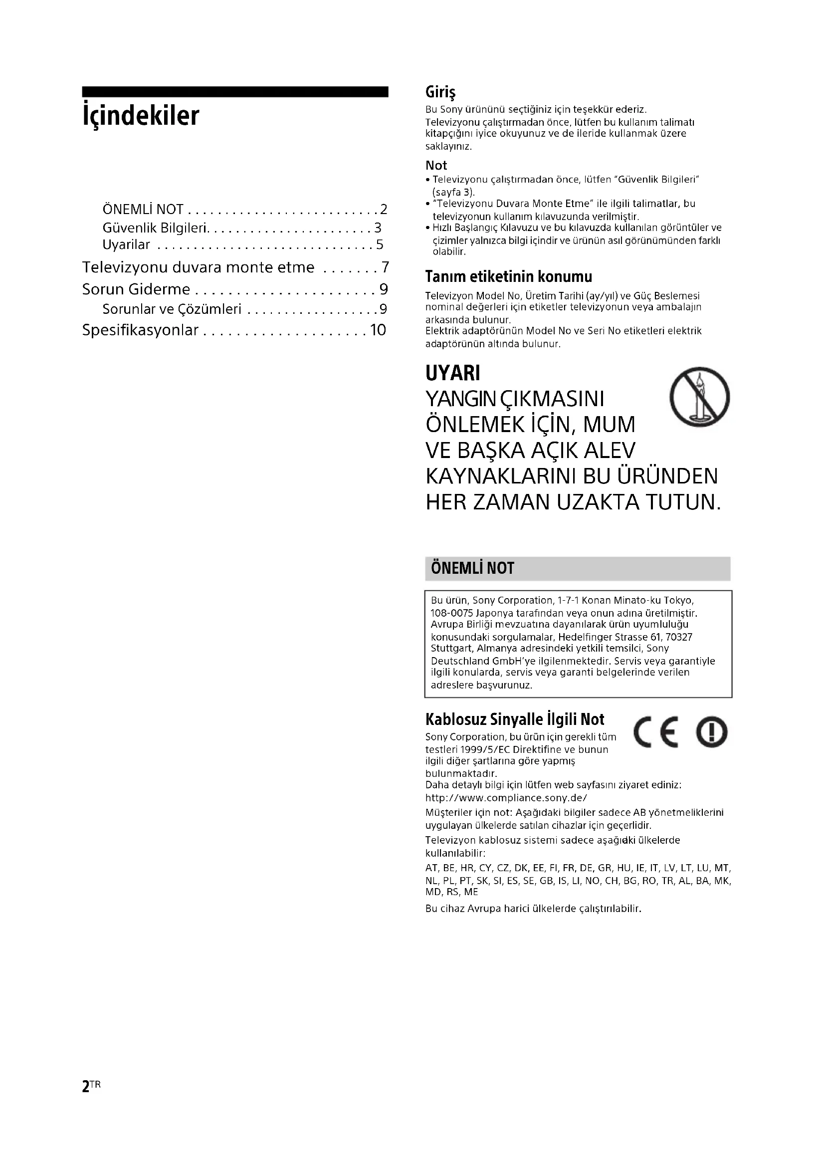 HER ZAMAN UZAKTA TUTUN. Kablosuz Sinyalle İlgili Not Sony Corporation, bu ürün için gerekli tüm testleri 1999/5/EC Direktifine ve bunun ilgili diğer şartlarına göre yapmış bulunmaktadır.Daha detaylı bilgi için lütfen web sayfasını ziyaret ediniz:http://www.compliance.sony.de/ Müşteriler için not: Aşağıdaki bilgiler sadece AB yönetmeliklerini uygulayan ülkelerde satılan cihazlar için geçerlidir.Televizyon kablosuz sistemi sadece aşağıdaki ülkelerde kullanılabilir:AT, BE, HR, CY, CZ, DK, EE, FI, FR, DE, GR, HU, IE, IT, LV, LT, LU, MT, NL, PL, PT, SK, SI, ES, SE, GB, IS, LI, NO, CH, BG, RO, TR, AL, BA, MK, MD, RS, MEBu cihaz Avrupa harici ülkelerde çalıştırılabilir. ÖNEMLİ NOT Bu ürün, Sony Corporation, 1-7-1 Konan Minato-ku Tokyo, 108-0075 Japonya tarafından veya onun adına üretilmiştir. Avrupa Birliği mevzuatına dayanılarak ürün uyumluluğu konusundaki sorgulamalar, Hedelfinger Strasse 61, 70327 Stuttgart, Almanya adresindeki yetkili temsilci, Sony Deutschland GmbH’ye ilgilenmektedir. Servis veya garantiyle ilgili konularda, servis veya garanti belgelerinde verilen adreslere başvurunuz.GB