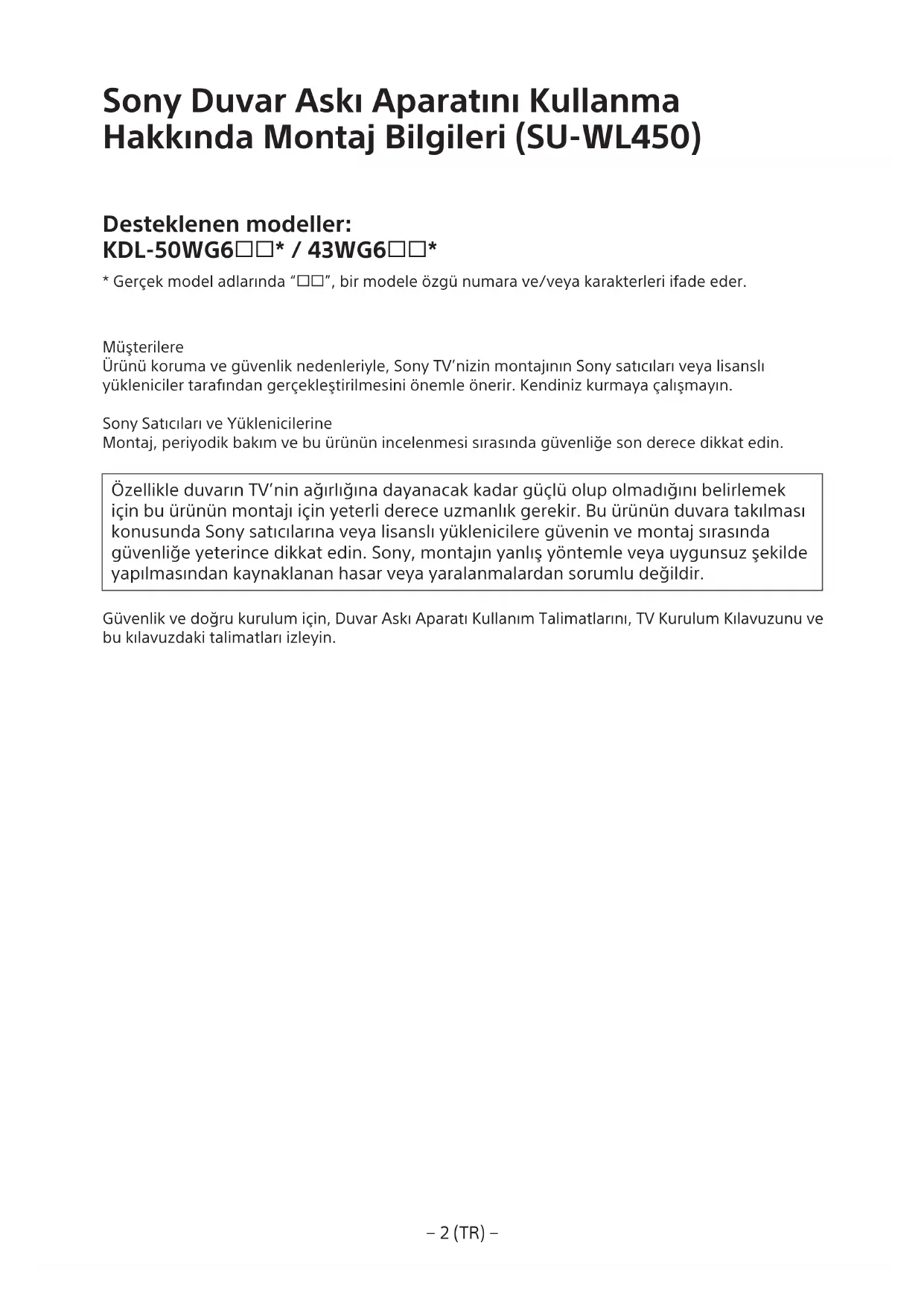 - Gerçek model adlarında “”, bir modele özgü numara ve/veya karakterleri ifade eder. Müşterilere Ürünü koruma ve güvenlik nedenleriyle, Sony TV’nizin montajının Sony satıcıları veya lisanslı yükleniciler tarafından gerçekleştirilmesini önemle önerir. Kendiniz kurmaya çalışmayın. Sony Satıcıları ve Yüklenicilerine Montaj, periyodik bakım ve bu ürünün incelenmesi sırasında güvenliğe son derece dikkat edin. Özellikle duvarın TV’nin ağırlığına dayanacak kadar güçlü olup olmadığını belirlemek için bu ürünün montajı için yeterli derece uzmanlık gerekir. Bu ürünün duvara takılması konusunda Sony satıcılarına veya lisanslı yüklenicilere güvenin ve montaj sırasında güvenliğe yeterince dikkat edin. Sony, montajın yanlış yöntemle veya uygunsuz şekilde yapılmasından kaynaklanan hasar veya yaralanmalardan sorumlu değildir. Güvenlik ve doğru kurulum için, Duvar Askı Aparatı Kullanım Talimatlarını, TV Kurulum Kılavuzunu ve bu kılavuzdaki talimatları izleyin.− 3 (TR) − Güvenlik Bu ürünü satın aldığınız için teşekkür ederiz. Müşterilerimize Bu ürünü monte etmek için yeterli derecede uzmanlık gereklidir. Montajı mutlaka Sony Bayilerine veya lisanslı yüklenicilerine yaptırın ve montaj sırasında güvenliğe özellikle dikkat edin. Sony, montajın yanlış yöntemle veya uygunsuz şekilde yapılmasından veya belirtilen ürünün dışında bir ürünün montajından kaynaklanan hasar veya yaralanmalardan sorumlu değildir. Yasal Haklarınız (varsa) etkilenmez. Sony Bayilerine Bu ürünü monte etmek için yeterli derecede uzmanlık gereklidir. Montaj işinin güvenli bir şekilde yapılması için mutlaka bu kullanım kılavuzunun tamamını okuyun. Sony, montajın yanlış yöntemle veya uygunsuz şekilde yapılmasından kaynaklanan hasarlardan veya yaralanmalardan sorumlu değildir. Montajdan sonra lütfen bu kılavuzu müşteriye verin. Bu kullanım kılavuzunda ürünün doğru kullanımı ve kazaları önlemek için alınması gereken önemli tedbirler açıklanmaktadır. Bu kılavuzun tamamını okuduğunuzdan ve ürünü doğru şekilde kullandığınızdan emin olun. Bu kılavuzu ileride başvurmak için saklayın. Sony ürünleri güvenliğe önem verilerek tasarlanmıştır. Ürünlerin yanlış kullanılması yangın, elektrik çarpması, ürünün devrilmesi veya ürünün düşmesi sonucunda ciddi yaralanmaya neden olabilir. Bu gibi kazalar önlemek için güvenlik tedbirlerine mutlaka uyun. Üretici Firma: Sony Visual Products Inc. 2-10-1 Osaki Shinagawa-ku Tokyo, 141-8610 Japonya Telefon: (+81 3) 6748 2111 Türkiye İrtibat Numaraları: Tel: 0216-633 98 00 Faks: 0216-632 70 30 e-mail: bilgi@eu.sony.com AEEE Yönetmeliğine Uygundur PCB içermez İthalatçı Firma: Sony Eurasia Pazarlama A.Ş. Adres: Onur Ofis Park Plaza Saray Mah. Ahmet Tevfik İleri Cad. No:10 34768 Ümraniye İstanbul Türkiye Sony Bilgi ve Danışma Hattı: 444 SONY (7669) (+90 216) 633 98 00 DİKKAT Belirtilen ürünler Bu Duvar Askı Aparatı belirtilen televizyonlarla kullanılacak şekilde tasarlanmıştır. Televizyonlar için, Duvar Askı Aparatının kullanılabildiğini doğrulamak için televizyonların Başvuru Kılavuzuna bakın. Müşterilerimize UYARI Aşağıdaki tedbirler alınmaması, yangın, elektrik çarpması veya ürünün düşmesi sonucunda ciddi yaralanmaya veya ölüme neden olabilir. Montajı mutlaka lisanslı yüklenicilere yaptırın ve montaj sırasında küçük çocukları uzak tutun. Duvar Askı Aparatı veya televizyon doğru monte edilmezse, aşağıdaki kazalar meydana gelebilir. Montajı mutlaka lisanslı yüklenicilere yaptırın.
