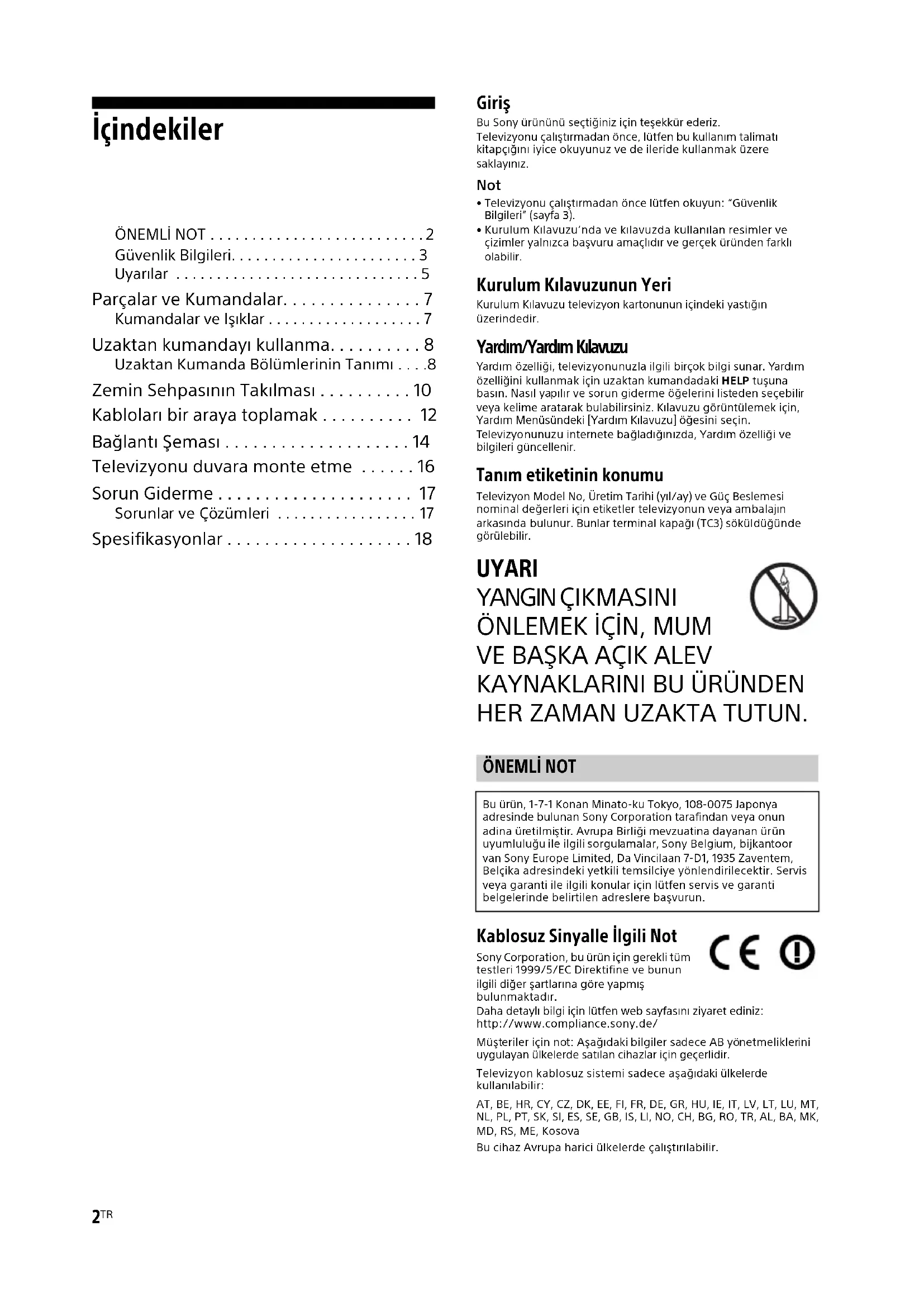 HER ZAMAN UZAKTA TUTUN. Kablosuz Sinyalle İlgili Not Sony Corporation, bu ürün için gerekli tüm testleri 1999/5/EC Direktifine ve bunun ilgili diğer şartlarına göre yapmış bulunmaktadır.Daha detaylı bilgi için lütfen web sayfasını ziyaret ediniz:http://www.compliance.sony.de/ Müşteriler için not: Aşağıdaki bilgiler sadece AB yönetmeliklerini uygulayan ülkelerde satılan cihazlar için geçerlidir.Televizyon kablosuz sistemi sadece aşağıdaki ülkelerde kullanılabilir:AT, BE, HR, CY, CZ, DK, EE, FI, FR, DE, GR, HU, IE, IT, LV, LT, LU, MT, NL, PL, PT, SK, SI, ES, SE, GB, IS, LI, NO, CH, BG, RO, TR, AL, BA, MK, MD, RS, ME, KosovaBu cihaz Avrupa harici ülkelerde çalıştırılabilir. ÖNEMLİ NOT Bu ürün, 1-7-1 Konan Minato-ku Tokyo, 108-0075 Japonya adresinde bulunan Sony Corporation tarafindan veya onun adina üretilmiştir. Avrupa Birliği mevzuatina dayanan ürün uyumluluğu ile ilgili sorgulamalar, Sony Belgium, bijkantoor van Sony Europe Limited, Da Vincilaan 7-D1, 1935 Zaventem, Belçika adresindeki yetkili temsilciye yönlendirilecektir. Servis veya garanti ile ilgili konular için lütfen servis ve garanti belgelerinde belirtilen adreslere başvurun.3