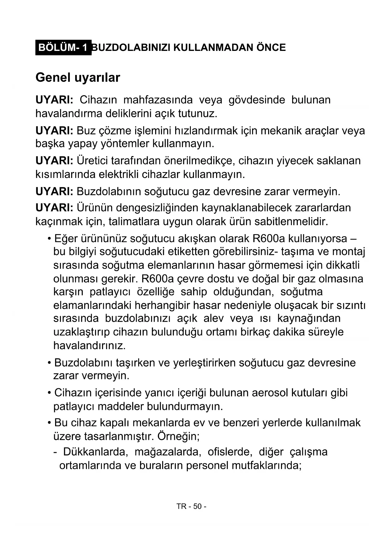 Genel uyarılar UYARI: Cihazın mahfazasında veya gövdesinde bulunan havalandırma deliklerini açık tutunuz. UYARI: Buz çözme işlemini hızlandırmak için mekanik araçlar veya başka yapay yöntemler kullanmayın. UYARI: Üretici tarafından önerilmedikçe, cihazın yiyecek saklanan kısımlarında elektrikli cihazlar kullanmayın. UYARI: Buzdolabının soğutucu gaz devresine zarar vermeyin. UYARI: Ürünün dengesizliğinden kaynaklanabilecek zararlardan kaçınmak için, talimatlara uygun olarak ürün sabitlenmelidir.