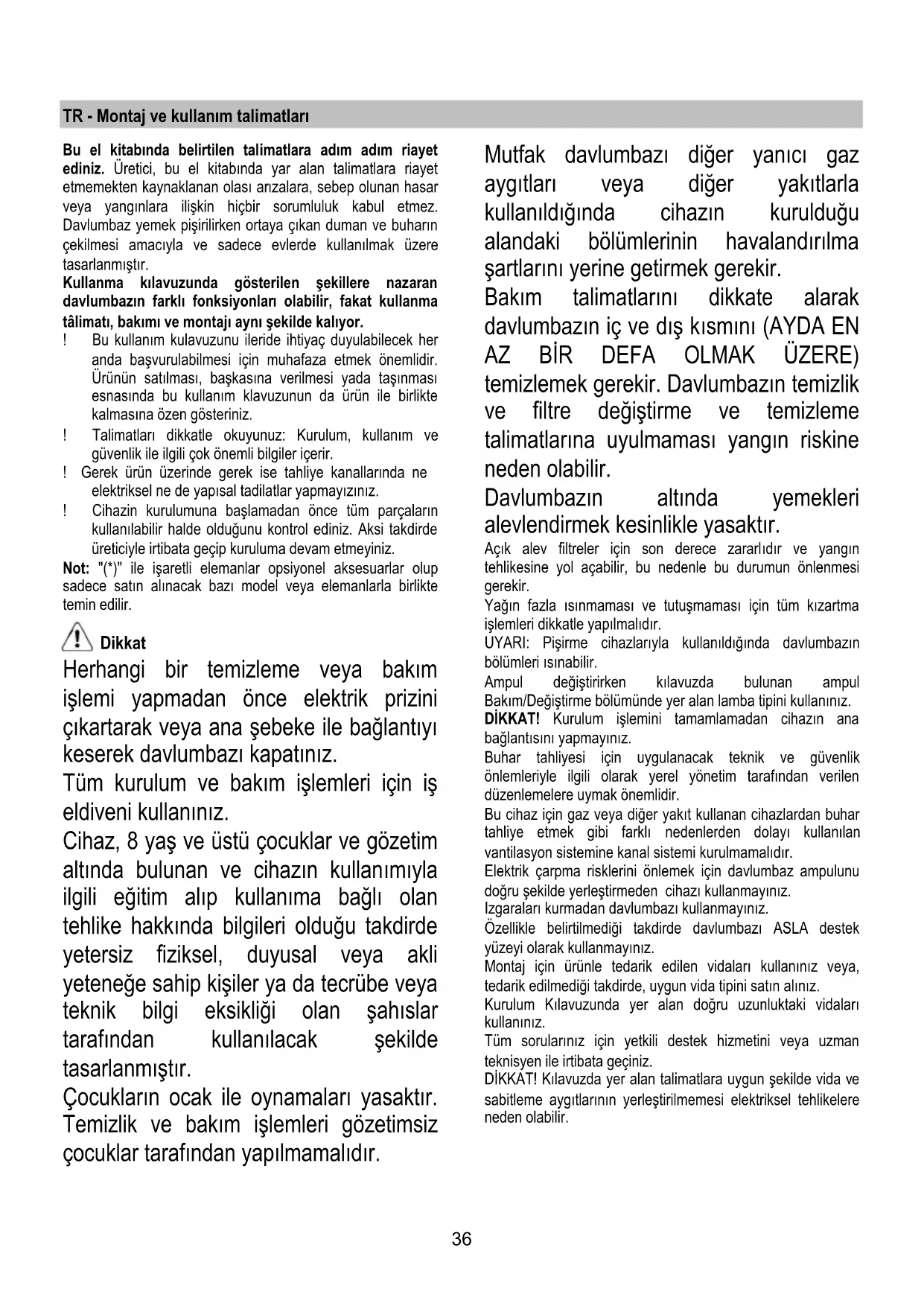 Για την αντικατάσταση τους, απευθυνθείτε στην υπηρεσία τεχνικής βοήθειας36 TR - Montaj ve kullanım talimatları Bu el kitabında belirtilen talimatlara adım adım riayet ediniz. Üretici, bu el kitabında yar alan talimatlara riayet etmemekten kaynaklanan olası arızalara, sebep olunan hasar veya yangınlara ilişkin hiçbir sorumluluk kabul etmez. Davlumbaz yemek pişirilirken ortaya çıkan duman ve buharın çekilmesi amacıyla ve sadece evlerde kullanılmak üzere tasarlanmıştır. Kullanma kılavuzunda gösterilen şekillere nazaran davlumbazın farklı fonksiyonları olabilir, fakat kullanma tâlimatı, bakımı ve montajı aynı şekilde kalıyor. ! Bu kullanım kulavuzunu ileride ihtiyaç duyulabilecek her anda başvurulabilmesi için muhafaza etmek önemlidir. Ürünün satılması, başkasına verilmesi yada taşınması esnasında bu kullanım klavuzunun da ürün ile birlikte kalmasına özen gösteriniz. ! Talimatları dikkatle okuyunuz: Kurulum, kullanım ve güvenlik ile ilgili çok önemli bilgiler içerir. ! Gerek ürün üzerinde gerek ise tahliye kanallarında ne elektriksel ne de yapısal tadilatlar yapmayızınız. ! Cihazin kurulumuna başlamadan önce tüm parçaların kullanılabilir halde olduğunu kontrol ediniz. Aksi takdirde üreticiyle irtibata geçip kuruluma devam etmeyiniz. Not: "(*)" ile işaretli elemanlar opsiyonel aksesuarlar olup sadece satın alınacak bazı model veya elemanlarla birlikte temin edilir. Dikkat Herhangi bir temizleme veya bakım işlemi yapmadan önce elektrik prizini çıkartarak veya ana şebeke ile bağlantıyı keserek davlumbazı kapatınız. Tüm kurulum ve bakım işlemleri için iş eldiveni kullanınız. Cihaz, 8 yaş ve üstü çocuklar ve gözetim altında bulunan ve cihazın kullanımıyla ilgili eğitim alıp kullanıma bağlı olan tehlike hakkında bilgileri olduğu takdirde yetersiz fiziksel, duyusal veya akli yeteneğe sahip kişiler ya da tecrübe veya teknik bilgi eksikliği olan şahıslar tarafından kullanılacak şekilde tasarlanmıştır. Çocukların ocak ile oynamaları yasaktır. Temizlik ve bakım işlemleri gözetimsiz çocuklar tarafından yapılmamalıdır. Mutfak davlumbazı diğer yanıcı gaz aygıtları veya diğer yakıtlarla kullanıldığında cihazın kurulduğu alandaki bölümlerinin havalandırılma şartlarını yerine getirmek gerekir. Bakım talimatlarını dikkate alarak davlumbazın iç ve dış kısmını (AYDA EN AZ BİR DEFA OLMAK ÜZERE) temizlemek gerekir. Davlumbazın temizlik ve filtre değiştirme ve temizleme talimatlarına uyulmaması yangın riskine neden olabilir. Davlumbazın altında yemekleri alevlendirmek kesinlikle yasaktır. Açık alev filtreler için son derece zararlıdır ve yangın tehlikesine yol açabilir, bu nedenle bu durumun önlenmesi gerekir. Yağın fazla ısınmaması ve tutuşmaması için tüm kızartma işlemleri dikkatle yapılmalıdır. UYARI: Pişirme cihazlarıyla kullanıldığında davlumbazın bölümleri ısınabilir. Ampul değiştirirken kılavuzda bulunan ampul Bakım/Değiştirme bölümünde yer alan lamba tipini kullanınız. DİKKAT! Kurulum işlemini tamamlamadan cihazın ana bağlantısını yapmayınız. Buhar tahliyesi için uygulanacak teknik ve güvenlik önlemleriyle ilgili olarak yerel yönetim tarafından verilen düzenlemelere uymak önemlidir. Bu cihaz için gaz veya diğer yakıt kullanan cihazlardan buhar tahliye etmek gibi farklı nedenlerden dolayı kullanılan vantilasyon sistemine kanal sistemi kurulmamalıdır. Elektrik çarpma risklerini önlemek için davlumbaz ampulunu doğru şekilde yerleştirmeden cihazı kullanmayınız. Izgaraları kurmadan davlumbazı kullanmayınız. Özellikle belirtilmediği takdirde davlumbazı ASLA destek yüzeyi olarak kullanmayınız. Montaj için ürünle tedarik edilen vidaları kullanınız veya, tedarik edilmediği takdirde, uygun vida tipini satın alınız. Kurulum Kılavuzunda yer alan doğru uzunluktaki vidaları kullanınız. Tüm sorularınız için yetkili destek hizmetini veya uzman teknisyen ile irtibata geçiniz. DİKKAT! Kılavuzda yer alan talimatlara uygun şekilde vida ve sabitleme aygıtlarının yerleştirilmemesi elektriksel tehlikelere neden olabilir.37 Bu cihaz, 2012/19/EC sayılı Avrupa Atık Elektrik ve Elektronik Ekipman Yönergesi (WEEE) uyarınca işaretlenmiştir. Bu ürünün uygun bir şekilde atılmasını sağladığınız takdirde, çevre ve insan sağlığı açısından söz konusu ürünün uygunsuz bir şekilde işleme tabi tutulması sonucu ortaya çıkabilecek olası olumsuz etkileri önlemiş olacaksınız. Ürün ya da ürün ile beraber verilen belgeler üzerinde bulunan sembolü, bu cihazın evsel bir atık olarak görülmemesi gerektiğine işaret eder. Cihaz, bu tip elektrikli ve elektronik cihazların atıldığı dönüşümlü toplama noktasına teslim edilmelidir. Atıkları yok etme işlemi, atık yok etme konusunda çevre ile ilgili mevcut yerel düzenlemeler doğrultusunda gerçekleştirilmelidir. Bu ürünün geri dönüşüm koşulları hakkında ayrıntılı bilgi için, hudutları içinde bulunduğunuz belediyenin ilgili dairesine, atık yok etme servisine veya ürünün satıcısına danışın. Bu aygıt aşağıda belirtilenlere göre tasarlanmış, test edilmiş ve üretilmiştir: