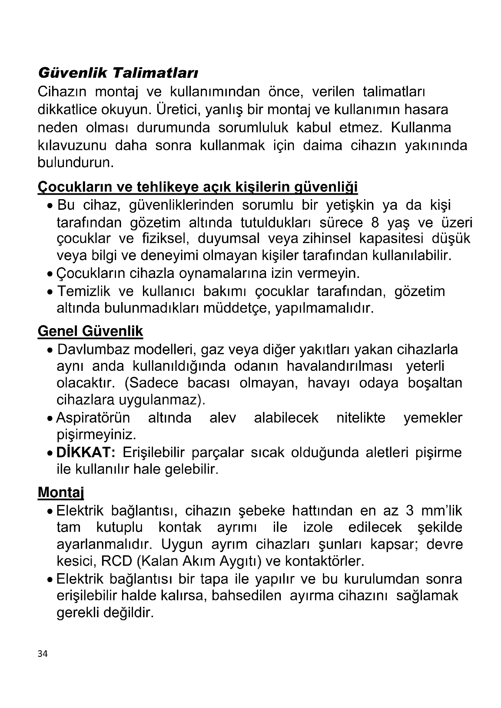 Eliminação da embalagem A embalagem está assinalada com o Ponto Verde. Para eliminar todos os materiais de embalamento, como o cartão, esferovite e as películas utilize os contentores adequados. Deste modo é garantida a reutilização dos materiais de embalamento. Eliminação de aparelhos fora de uso A diretiva Europeia 2012/19/UE referente à gestão de Resíduos de Equipamentos Elétricos e Eletrónicos (REEE), prevê que os eletrodomésticos não devem ser escoados no fluxo normal dos resíduos sólidos urbanos. Os aparelhos desatualizados devem ser recolhidos separadamente para otimizar a taxa de recuperação e reciclagem dos materiais que os compõem e impedir potenciais danos para a saúde humana e para o ambiente. O símbolo constituído por um contentor de lixo barrado com uma cruz deve ser colocado em todos os produtos de forma a recordar a obrigatoriedade de recolha separada. Os consumidores devem contactar as autoridades locais ou os pontos de venda para solicitar informação referente ao local apropriado onde devem depositar os eletrodomésticos velhos. Antes de eliminar o seu aparelho, inutilize-o. Puxe o cabo de alimentação, corte-o e elimine-o.34 Güvenlik Talimatları Cihazın montaj ve kullanımından önce, verilen talimatları dikkatlice okuyun. Üretici, yanlış bir montaj ve kullanımın hasara neden olması durumunda sorumluluk kabul etmez. Kullanma kılavuzunu daha sonra kullanmak için daima cihazın yakınında bulundurun. Çocukların ve tehlikeye açık kişilerin güvenliği Bu cihaz, güvenliklerinden sorumlu bir yetişkin ya da kişi tarafından gözetim altında tutuldukları sürece 8 yaş ve üzeri çocuklar ve fiziksel, duyumsal veya zihinsel kapasitesi düşük veya bilgi ve deneyimi olmayan kişiler tarafından kullanılabilir. Çocukların cihazla oynamalarına izin vermeyin. Temizlik ve kullanıcı bakımı çocuklar tarafından, gözetim altında bulunmadıkları müddetçe, yapılmamalıdır. Genel Güvenlik Davlumbaz modelleri, gaz veya diğer yakıtları yakan cihazlarla aynı anda kullanıldığında odanın havalandırılması yeterli olacaktır. (Sadece bacası olmayan, havayı odaya boşaltan cihazlara uygulanmaz). Aspiratörün altında alev alabilecek nitelikte yemekler pişirmeyiniz. DİKKAT: Erişilebilir parçalar sıcak olduğunda aletleri pişirme ile kullanılır hale gelebilir. Montaj Elektrik bağlantısı, cihazın şebeke hattından en az 3 mm’lik tam kutuplu kontak ayrımı ile izole edilecek şekilde ayarlanmalıdır. Uygun ayrım cihazları şunları kapsar; devre kesici, RCD (Kalan Akım Aygıtı) ve kontaktörler. Elektrik bağlantısı bir tapa ile yapılır ve bu kurulumdan sonra erişilebilir halde kalırsa, bahsedilen ayırma cihazını sağlamak gerekli değildir.35