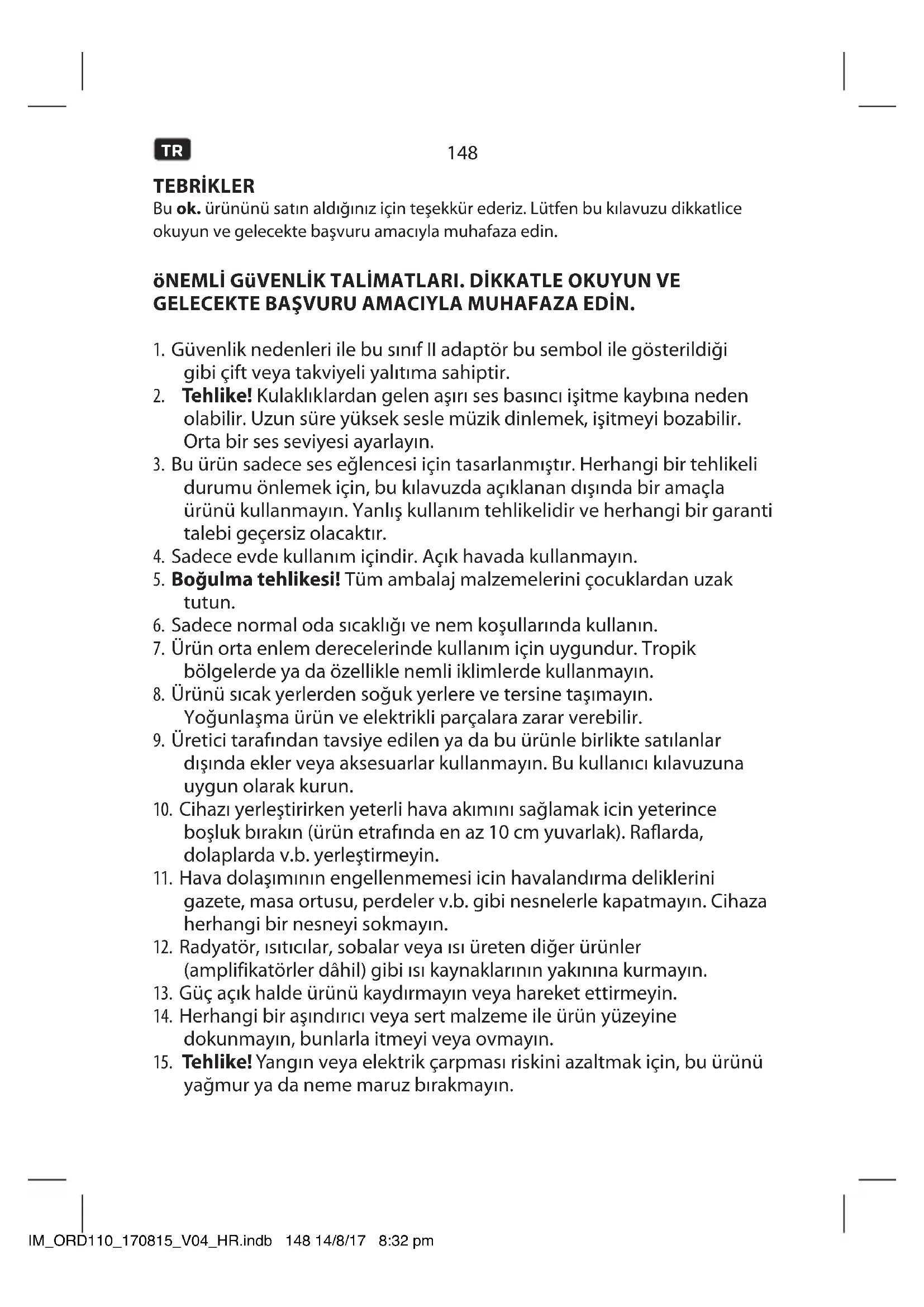 J. Kulaklık fişi K. DC-IN fişi L. Pil bölmesi M. AC/DC-Adaptörü AKSESUARLAR 1 x AC/DC Adaptör 1 x Kullanıcı kılavuzu İLK KULLANİMDAN öNCE Ürünü ve aksesuarı dikkatlice orijinal ambalajdan çıkarın. Doğru tasfiyeyle ilgili sorularınız varsa belediyenize danışın. Ambalaj içeriğinin tam olup olmadığını ve hasar bakımından kontrol edin. Ambalaj içeriği eksik ise veya hasar tespit ederseniz derhal satış yerinize başvurun. IM_ORD110_170815_V04_HR.indb 151 14/8/17 8:32 pm152