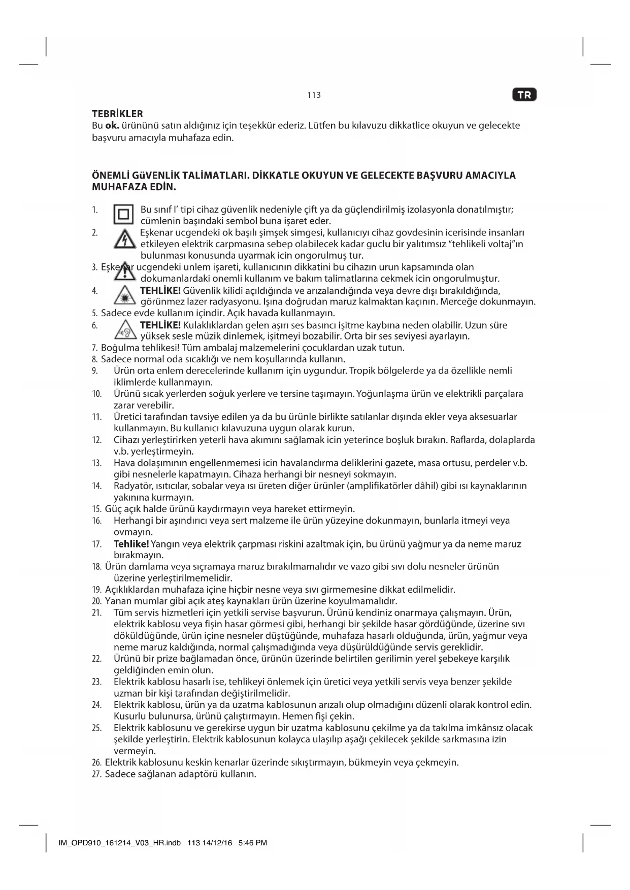 fonksiyonda fişi çekin ve tekrar takın ya da pili çıkarın ve tekrar takın. KULLANIM AMACI Bu ürün sadece audio ve video eğlencesi içindir. Başka herhangi bir kullanım ürün hasarına veya yaralanmaya neden olabilir. Imtron GmbH, ürünün dikkatsiz ve uygunsuz kullanımından ya da üreticinin belirtmiş olduğu amacı karşılamayan ürün kullanımından kaynaklı ürün ve eşya hasarlarına veya kişisel yaralanmalara karşı sorumluluk kabul etmez. IM_OPD910_161214_V03_HR.indb 114 14/12/16 5:46 PM115
