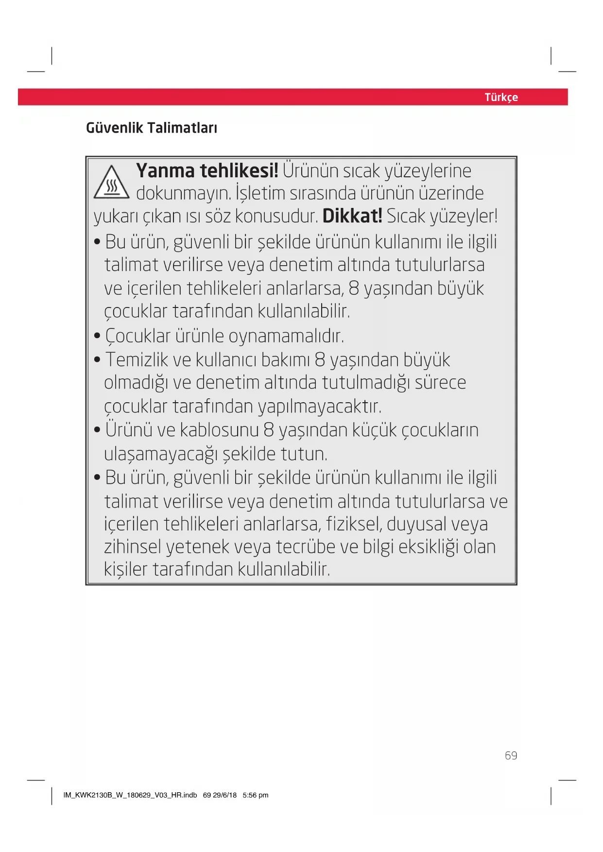 - Temizlik ve kullanıcı bakımı 8 yaşından büyük olmadığı ve denetim altında tutulmadığı sürece çocuklar tarafından yapılmayacaktır.