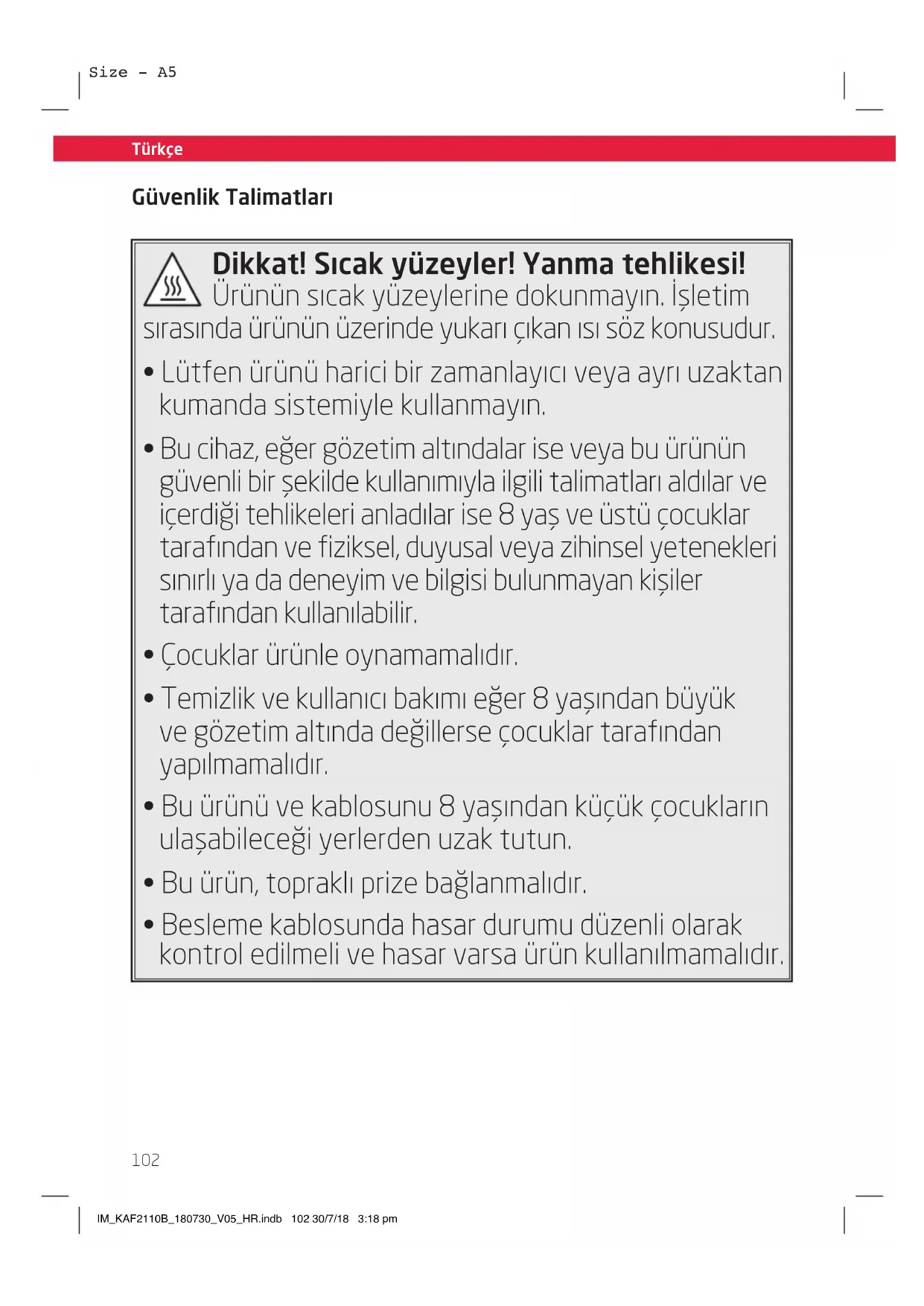 - Temizlik ve koruyucu bakim bölümünü dikkate alın. IM_KAF2110B_180730_V05_HR.indb 103 30/7/18 3:18 pmSize - A5 Türkçe