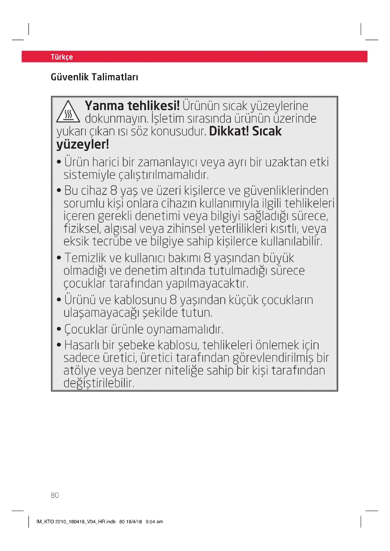 - Temizlik ve bakım bölümünü dikkate alın. IM_KTO 2210_180418_V04_HR.indb 81 18/4/18 9:54 amTürkçe