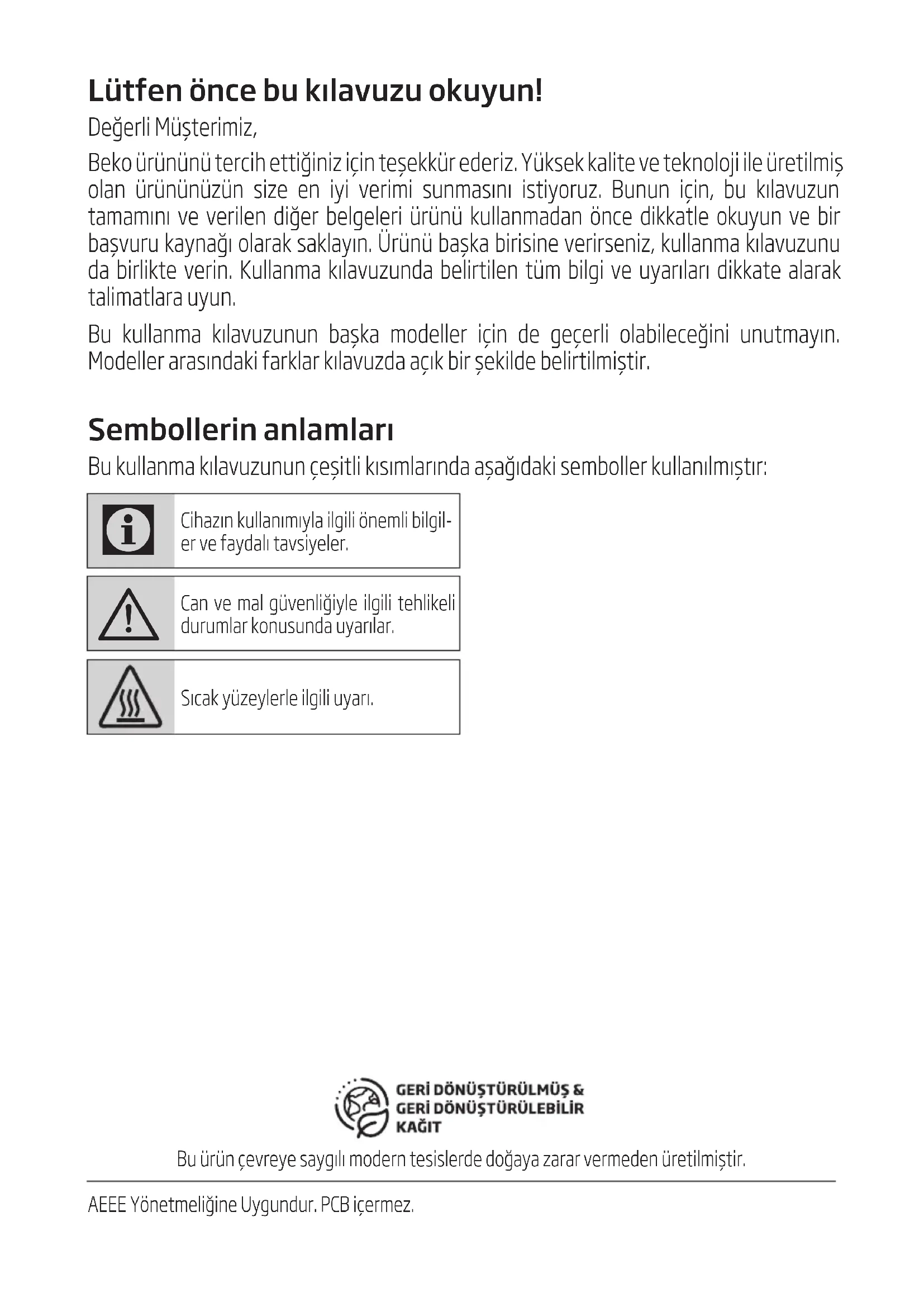 Niniejsze warunki gwarancji mają zastosowanie do Urządzeń zakupionych od dnia 01.03.2019 r. Gwarant oświadcza, że niniejsza Gwarancja jest udzielana Użytkownikowi dodatkowo i nie wyłącza, nie ogranicza ani nie zawiesza uprawnień Użytkownika wynikających z przepisów o rękojmi za wady rzeczy sprzedanej na podstawie Kodeksu cywilnego.Lütfen önce bu kılavuzu okuyun! Değerli Müşterimiz, Beko ürününü tercih ettiğiniz için teşekkür ederiz. Yüksek kalite ve teknoloji ile üretilmiş olan ürününüzün size en iyi verimi sunmasını istiyoruz. Bunun için, bu kılavuzun tamamını ve verilen diğer belgeleri ürünü kullanmadan önce dikkatle okuyun ve bir başvuru kaynağı olarak saklayın. Ürünü başka birisine verirseniz, kullanma kılavuzunu da birlikte verin. Kullanma kılavuzunda belirtilen tüm bilgi ve uyarıları dikkate alarak talimatlara uyun. Bu kullanma kılavuzunun başka modeller için de geçerli olabileceğini unutmayın. Modeller arasındaki farklar kılavuzda açık bir şekilde belirtilmiştir. Sembollerin anlamları Bu kullanma kılavuzunun çeşitli kısımlarında aşağıdaki semboller kullanılmıştır: