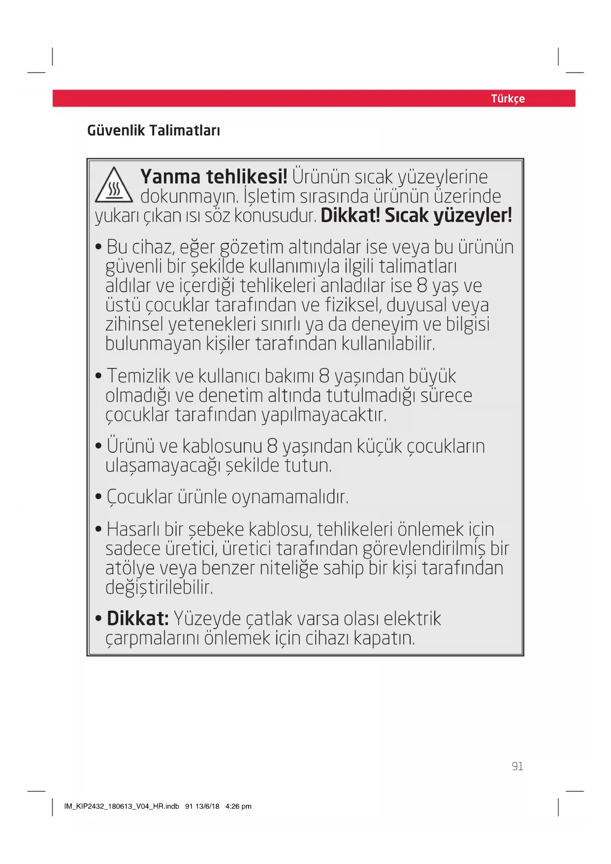 - Dikkat: Yüzeyde çatlak varsa olası elektrik çarpmalarını önlemek için cihazı kapatın. IM_KIP2432_180613_V04_HR.indb 91 13/6/18 4:26 pmTürkçe