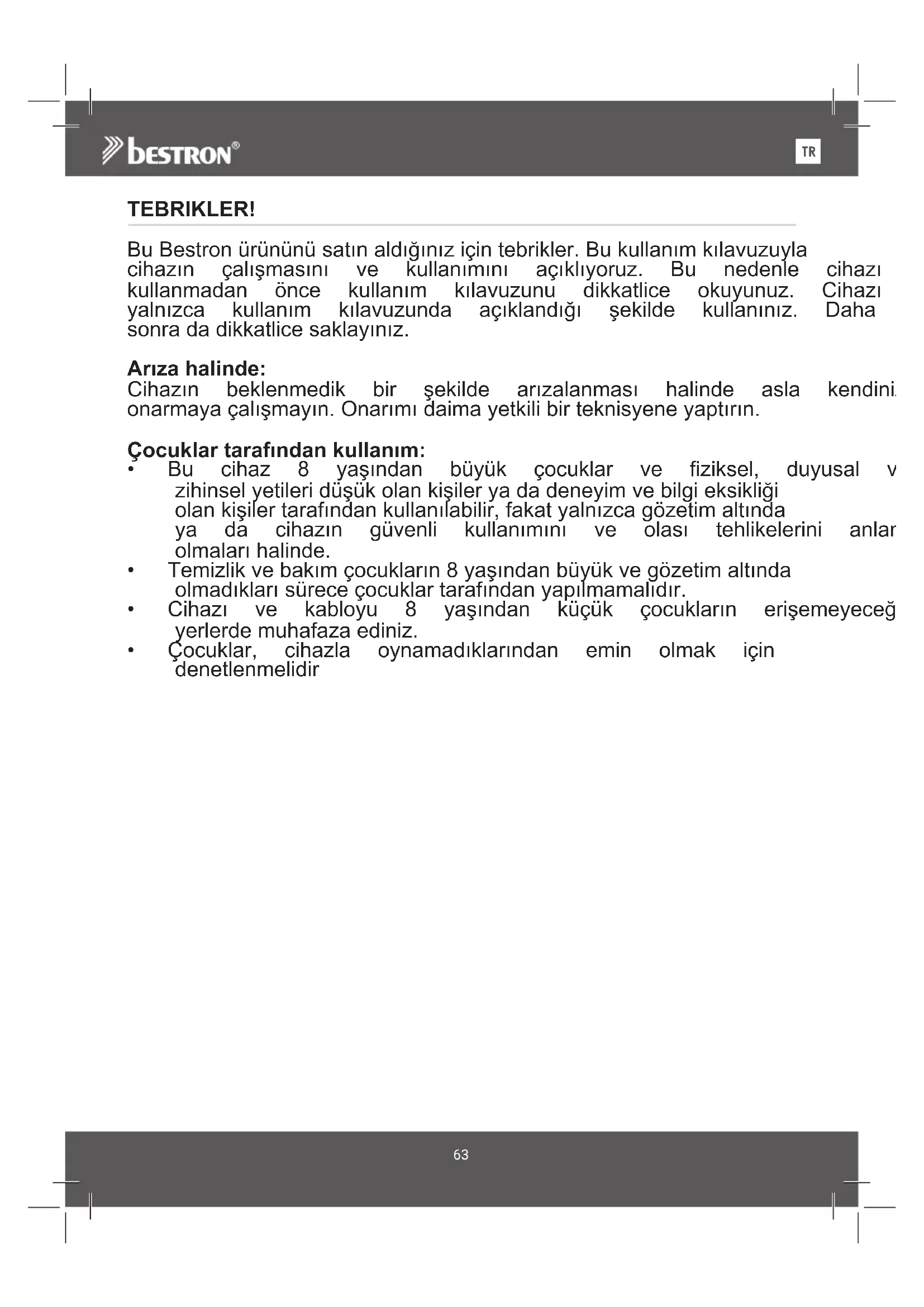 teBrikler! BuBestronürününüsatınaldığınıziçintebrikler.Bukullanımkılavuzuyla cihazın çalışmasını ve kullanımını açıklıyoruz. Bu nedenle cihazı kullanmadan önce kullanım kılavuzunu dikkatlice okuyunuz. Cihazı yalnızca kullanım kılavuzunda açıklandığı şekilde kullanınız. Daha sonradadikkatlicesaklayınız.