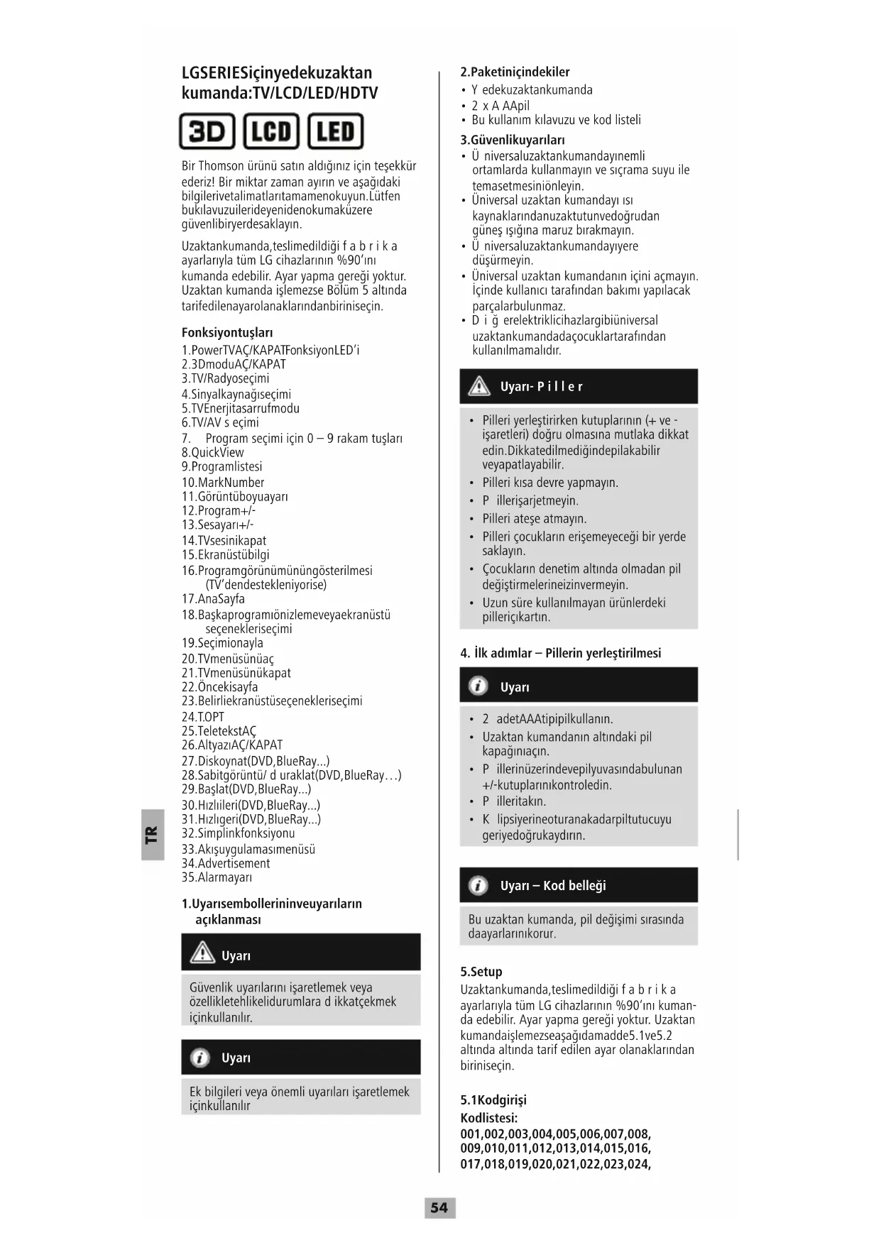 LG SERIES için yedek uzaktan kumanda: TV/LCD/LED/HDTV Bir Thomson ürünü satınaldığınıziçin teşekkür ederiz! Bir miktar zaman ayırınveaşağıdaki bilgileri ve talimatları tamamen okuyun. Lütfen bu kılavuzu ileride yeniden okumak üzere güvenli bir yerde saklayın. Uzaktan kumanda, teslim edildiğifabrika ayarlarıyla tüm LG cihazlarının%90’ını kumanda edebilir.Ayar yapma gereğiyoktur. Uzaktan kumanda işlemezse Bölüm 5altında tarif edilen ayar olanaklarından birini seçin. Fonksiyon tuşları