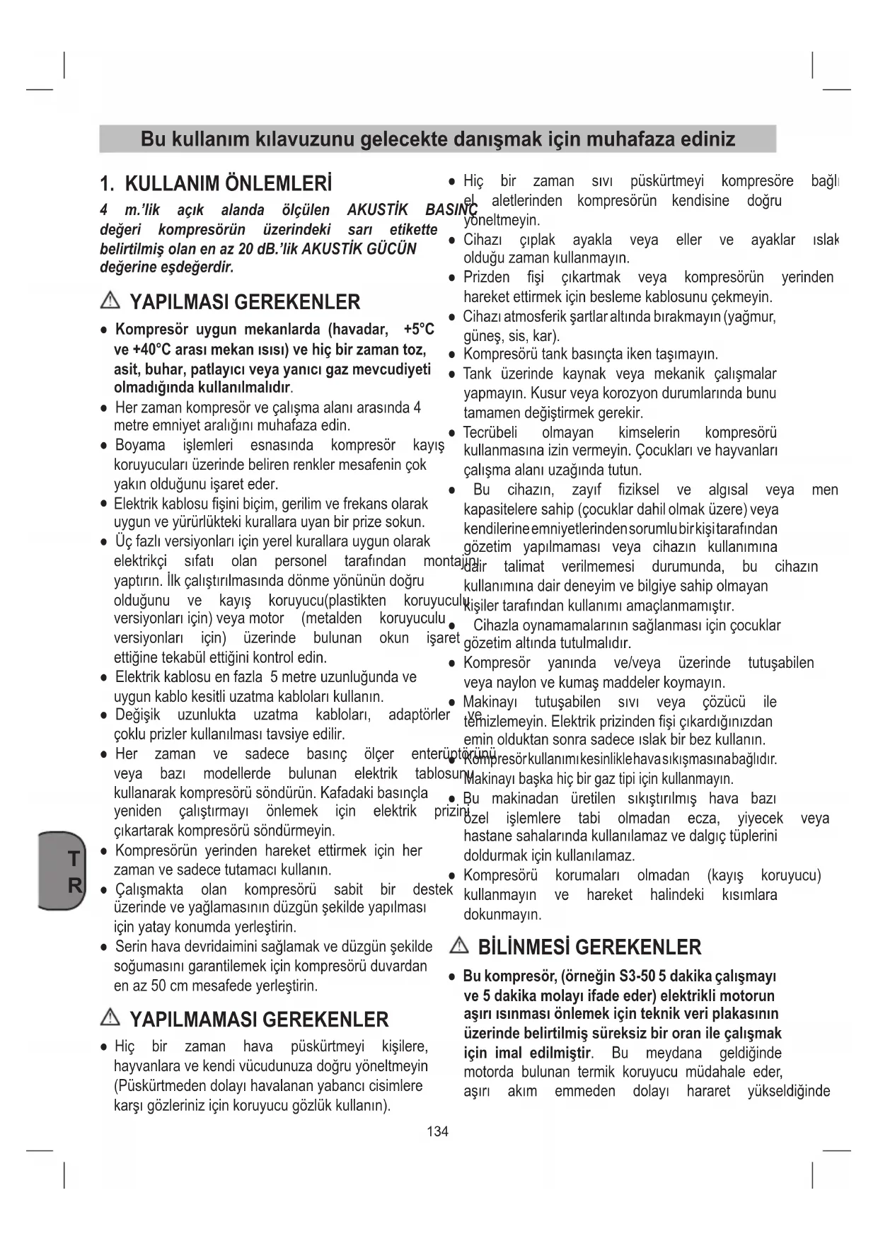 Elektrikkablosufişinibiçim,gerilimvefrekansolarak uygunveyürürlüktekikurallarauyanbirprizesokun. ● Üçfazlıversiyonlarıiçinyerelkurallarauygunolarak elektrikçi sıfatı olan personel tarafından montajını yaptırın.İlkçalıştırılmasındadönmeyönünündoğru olduğunu ve kayış koruyucu(plastikten koruyuculu versiyonlarıiçin)veyamotor (metalden koruyuculu versiyonları için) üzerinde bulunan okun işaret ettiğinetekabülettiğinikontroledin. ● Elektrikkablosuenfazla5metreuzunluğundave uygunkablokesitliuzatmakablolarıkullanın. ● Değişik uzunlukta uzatma kabloları, adaptörler ve çokluprizlerkullanılmasıtavsiyeedilir. ● Her zaman ve sadece basınç ölçer enterüptörünü veya bazı modellerde bulunan elektrik tablosunu kullanarakkompresörüsöndürün.Kafadakibasınçla yeniden çalıştırmayı önlemek için elektrik prizini çıkartarakkompresörüsöndürmeyin. ● Kompresörün yerinden hareket ettirmek için her zamanvesadecetutamacıkullanın. ● Çalışmakta olan kompresörü sabit bir destek üzerindeveyağlamasınındüzgünşekildeyapılması içinyataykonumdayerleştirin. ● Serinhavadevridaiminisağlamakvedüzgünşekilde soğumasınıgarantilemekiçinkompresörüduvardan enaz50cmmesafedeyerleştirin. YAPILMAMASI GEREKENLER ● Hiç bir zaman hava püskürtmeyi kişilere, hayvanlaravekendivücudunuzadoğruyöneltmeyin (Püskürtmedendolayıhavalananyabancıcisimlere karşıgözleriniziçinkoruyucugözlükkullanın). ● Hiç bir zaman sıvı püskürtmeyi kompresöre bağlı el aletlerinden kompresörün kendisine doğru yöneltmeyin. ● Cihazı çıplak ayakla veya eller ve ayaklar ıslak olduğuzamankullanmayın. ● Prizden fişi çıkartmak veya kompresörün yerinden hareketettirmekiçinbeslemekablosunuçekmeyin. ● Cihazıatmosferikşartlaraltındabırakmayın(yağmur, güneş,sis,kar). ● Kompresörütankbasınçtaikentaşımayın. ● Tank üzerinde kaynak veya mekanik çalışmalar yapmayın.Kusurveyakorozyondurumlarındabunu tamamendeğiştirmekgerekir. ● Tecrübeli olmayan kimselerin kompresörü kullanmasınaizinvermeyin.Çocuklarıvehayvanları çalışmaalanıuzağındatutun. ● Bu cihazın, zayıf fiziksel ve algısal veya mental kapasiteleresahip(çocuklardahilolmaküzere)veya kendilerineemniyetlerindensorumlubirkişitarafından gözetim yapılmaması veya cihazın kullanımına dair talimat verilmemesi durumunda, bu cihazın kullanımınadairdeneyimvebilgiyesahipolmayan kişilertarafındankullanımıamaçlanmamıştır. ● Cihazlaoynamamalarınınsağlanmasıiçinçocuklar gözetimaltındatutulmalıdır. ● Kompresör yanında ve/veya üzerinde tutuşabilen veyanaylonvekumaşmaddelerkoymayın. ● Makinayı tutuşabilen sıvı veya çözücü ile temizlemeyin.Elektrikprizindenfişiçıkardığınızdan eminolduktansonrasadeceıslakbirbezkullanın.