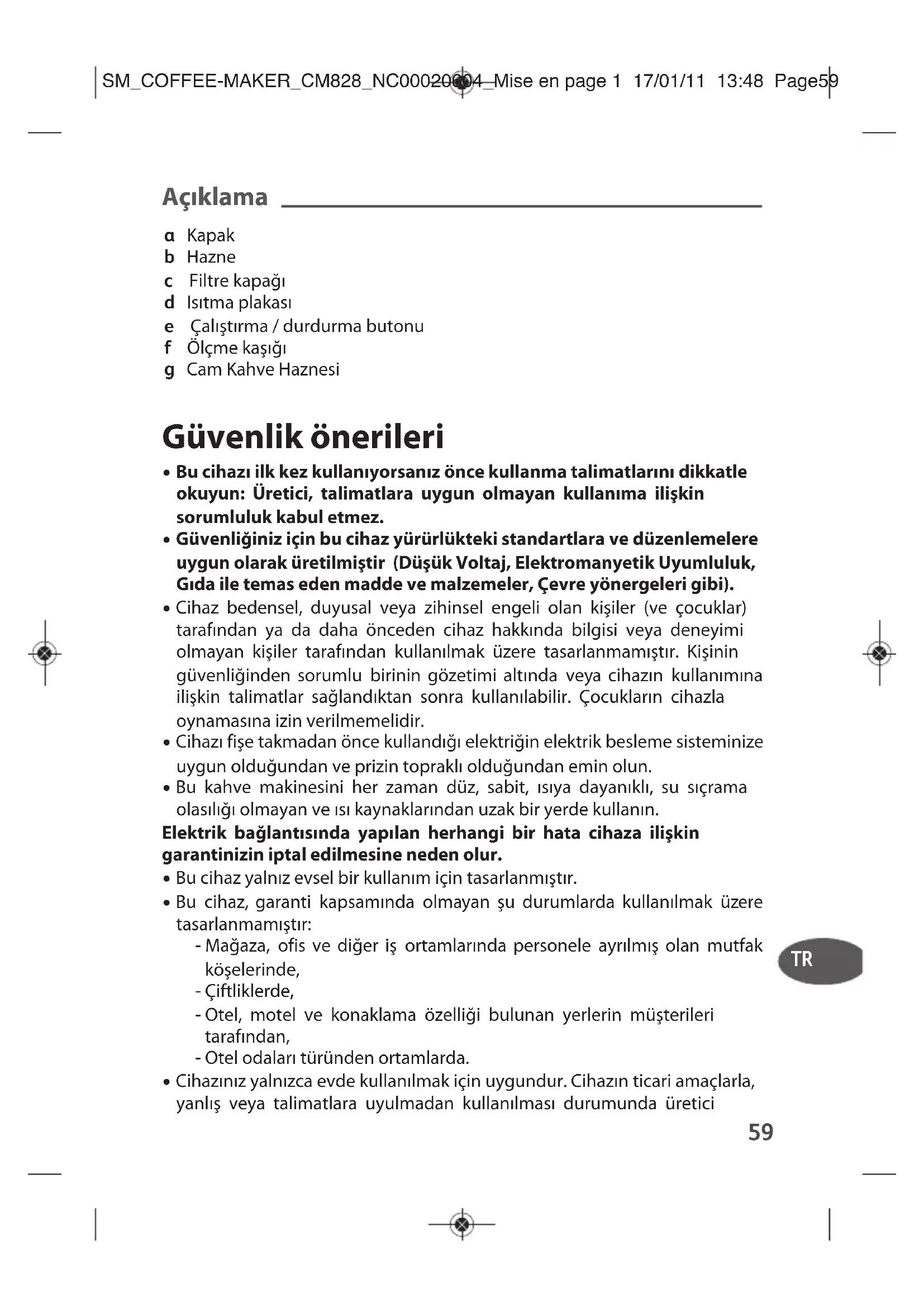 - Cihazınız yalnızca evde kullanılmak için uygundur. Cihazın ticari amaçlarla, yanlış veya talimatlara uyulmadan kullanılması durumunda üretici SM_COFFEE-MAKER_CM828_NC00020604_Mise en page 1 17/01/11 13:48 Page5960 sorumluluk kabul etmez ve garanti şartları uygulanmaz.