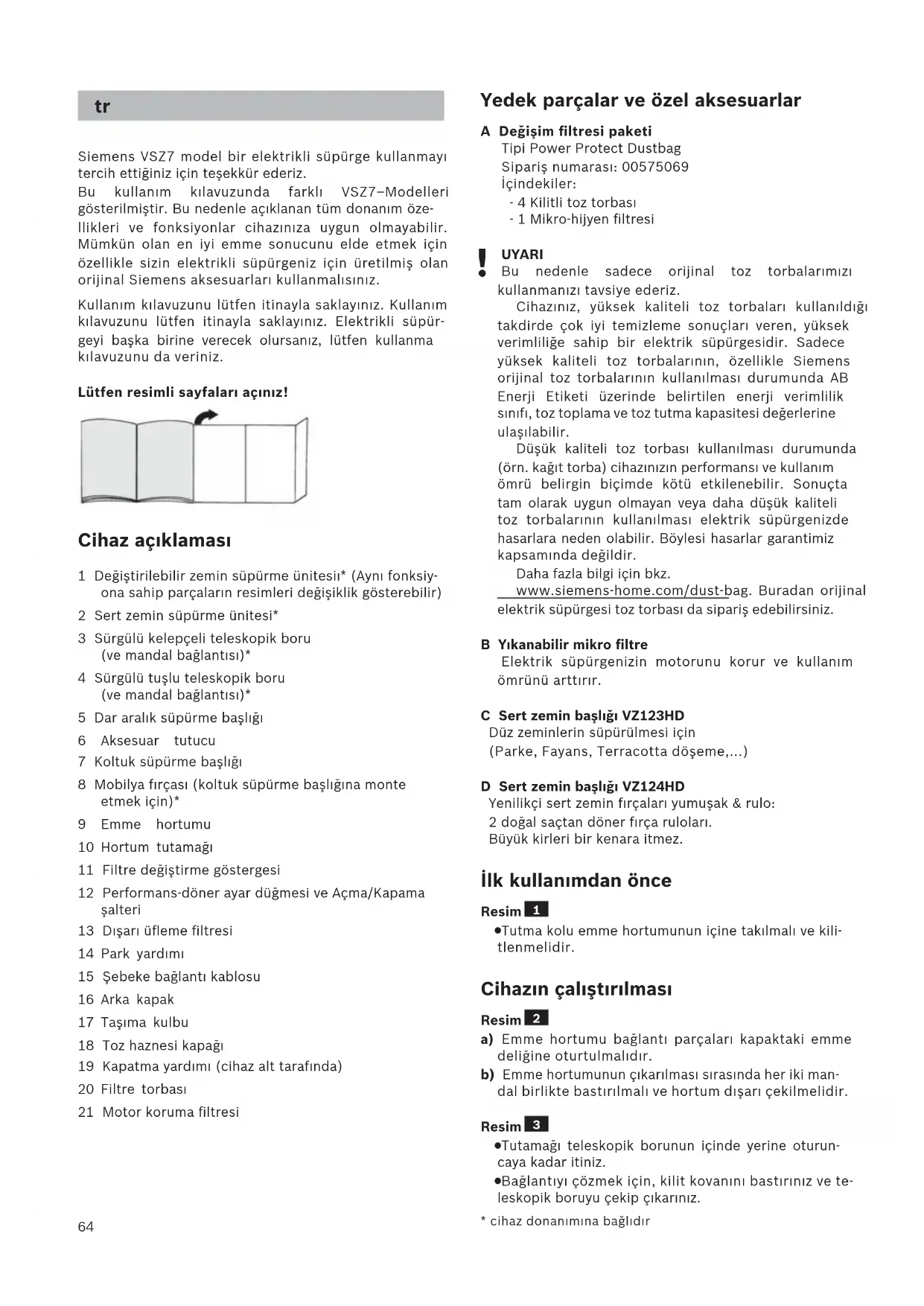 UYARI Bu nedenle sadece orijinal toz torbalarımızı kullanmanızı tavsiye ederiz. Cihazınız, yüksek kaliteli toz torbaları kullanıldığı takdirde çok iyi temizleme sonuçları veren, yüksek verimliliğe sahip bir elektrik süpürgesidir. Sadece yüksek kaliteli toz torbalarının, özellikle Siemens orijinal toz torbalarının kullanılması durumunda AB Enerji Etiketi üzerinde belirtilen enerji verimlilik sınıfı, toz toplama ve toz tutma kapasitesi değerlerine ulaşılabilir. Düşük kaliteli toz torbası kullanılması durumunda (örn. kağıt torba) cihazınızın performansı ve kullanım ömrü belirgin biçimde kötü etkilenebilir. Sonuçta tam olarak uygun olmayan veya daha düşük kaliteli toz torbalarının kullanılması elektrik süpürgenizde hasarlara neden olabilir. Böylesi hasarlar garantimiz kapsamında değildir. Daha fazla bilgi için bkz. www.siemens-home.com/dust-bag. Buradan orijinal elektrik süpürgesi toz torbası da sipariş edebilirsiniz. B Yıkanabilir mikro filtre Elektrik süpürgenizin motorunu korur ve kullanım ömrünü arttırır. C Sert zemin başlığı VZ123HD Düz zeminlerin süpürülmesi için (Parke, Fayans, Terracotta döşeme,...) D Sert zemin başlığı VZ124HD Yenilikçi sert zemin fırçaları yumuşak & rulo: 2 doğal saçtan döner fırça ruloları. Büyük kirleri bir kenara itmez. İlk kullanımdan önce Resim