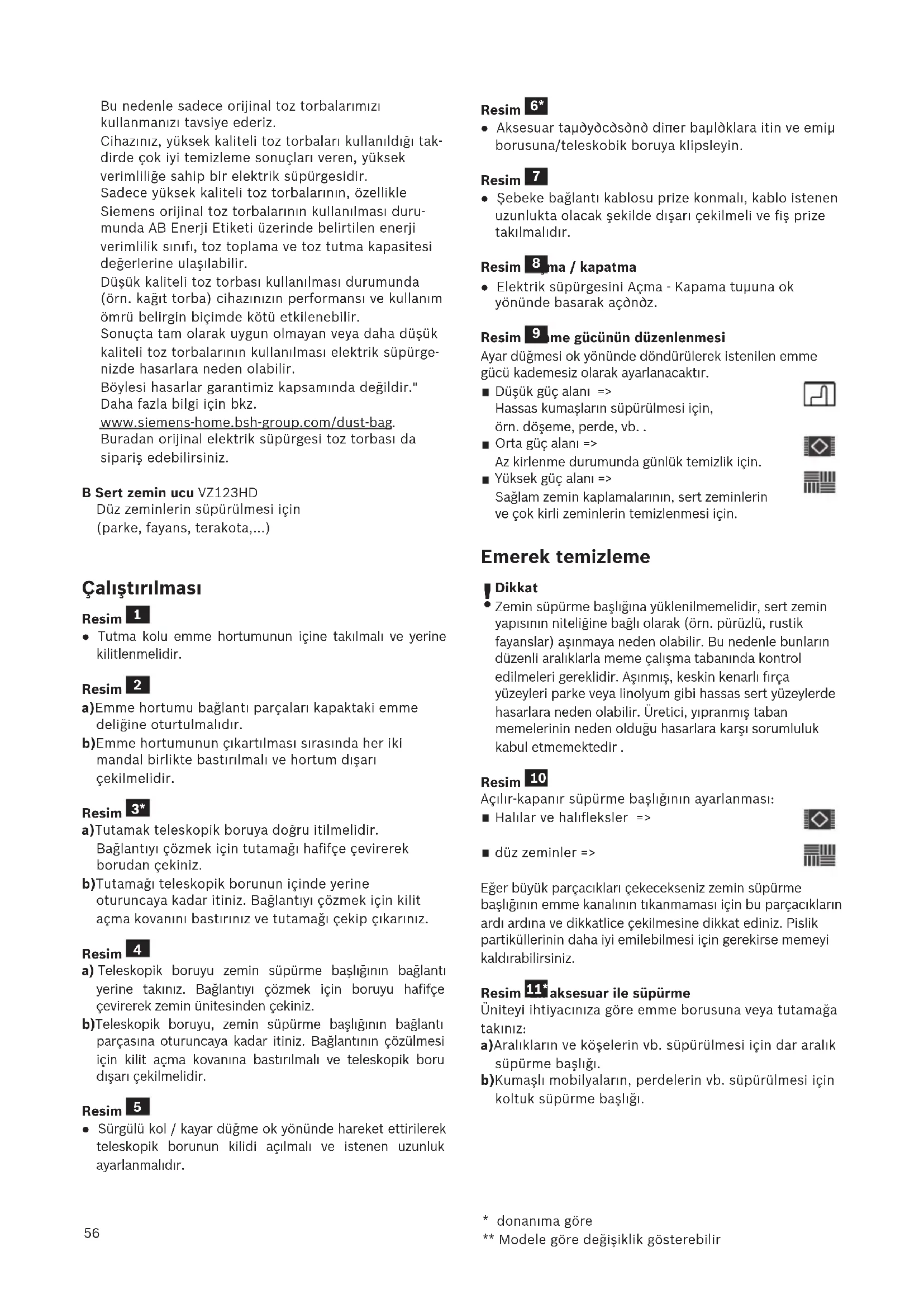 - donanıma göre ** Modele göre değişiklik gösterebilir56 Bu nedenle sadece orijinal toz torbalarımızı kullanmanızı tavsiye ederiz. Cihazınız, yüksek kaliteli toz torbaları kullanıldığı tak- dirde çok iyi temizleme sonuçları veren, yüksek verimliliğe sahip bir elektrik süpürgesidir. Sadece yüksek kaliteli toz torbalarının, özellikle Siemens orijinal toz torbalarının kullanılması duru- munda AB Enerji Etiketi üzerinde belirtilen enerji verimlilik sınıfı, toz toplama ve toz tutma kapasitesi değerlerine ulaşılabilir. Düşük kaliteli toz torbası kullanılması durumunda (örn. kağıt torba) cihazınızın performansı ve kullanım ömrü belirgin biçimde kötü etkilenebilir. Sonuçta tam olarak uygun olmayan veya daha düşük kaliteli toz torbalarının kullanılması elektrik süpürge- nizde hasarlara neden olabilir. Böylesi hasarlar garantimiz kapsamında değildir." Daha fazla bilgi için bkz. www.siemens-home.bsh-group.com/dust-bag