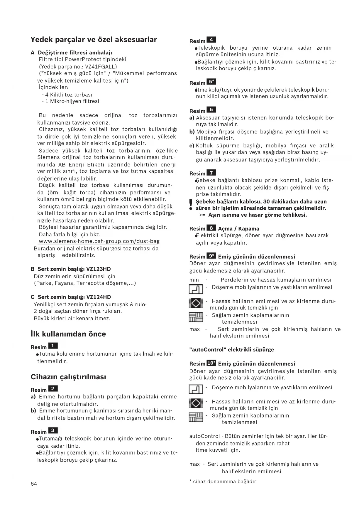 Emiş gücünün düzenlenmesi Döner ayar düğmesinin çevirilmesiyle istenilen emiş gücü kademesiz olarak ayarlanabilir. min - Perdelerin ve hassas kumaşların emilmesi - Döşeme mobilyalarının ve yastıkların emilmesi - Hassas halıların emilmesi ve az kirlenme duru- munda günlük temizlik için - Sağlam zemin kaplamalarının temizlenmesi max - Sert zeminlerin ve çok kirlenmiş halıların ve halıflekslerin emilmesi "autoControl" elektrikli süpürge Resim 10* Emiş gücünün düzenlenmesi Döner ayar düğmesinin çevirilmesiyle istenilen emiş gücü kademesiz olarak ayarlanabilir. - Döşeme mobilyalarının ve yastıkların emilmesi - Hassas halıların emilmesi ve az kirlenme duru- munda günlük temizlik için - Sağlam zemin kaplamalarının temizlenmesi autoControl - Bütün zeminler için tek bir ayar. Her tür- den zeminde temizlik yaparken rahat itme kuvveti için. max - Sert zeminlerin ve çok kirlenmiş halıların ve halıflekslerin emilmesi65