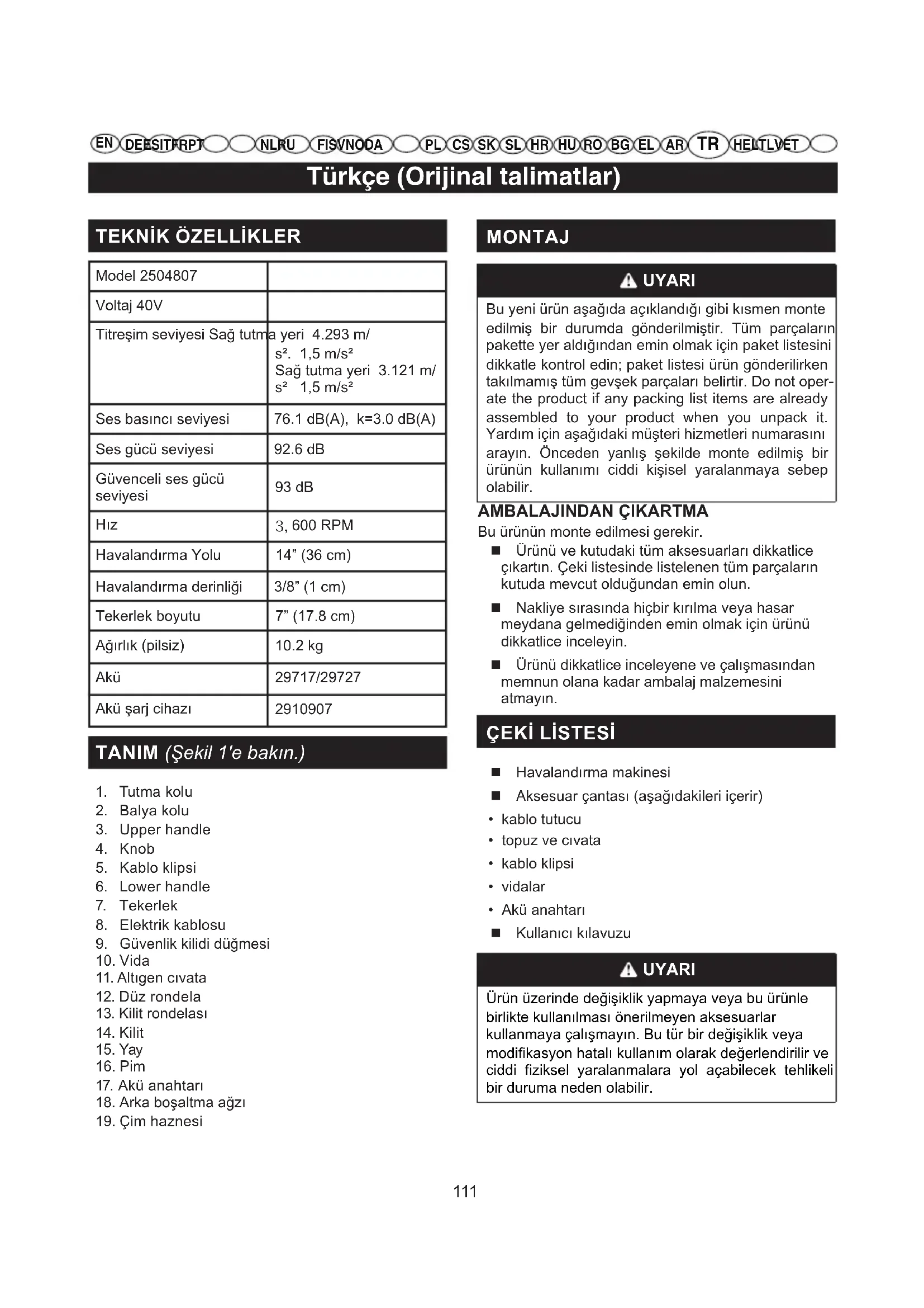 DE ES IT FR PTNL RUFI SV NO DA HE LT LV ET MONTAJ UYARI Bu yeni ürün aşağıda açıklandığı gibi kısmen monte edilmiş bir durumda gönderilmiştir. Tüm parçaların pakette yer aldığından emin olmak için paket listesini dikkatle kontrol edin; paket listesi ürün gönderilirken takılmamış tüm gevşek parçaları belirtir. Do not oper- ate the product if any packing list items are already assembled to your product when you unpack it. Yardım için aşağıdaki müşteri hizmetleri numarasını arayın. Önceden yanlış şekilde monte edilmiş bir ürünün kullanımı ciddi kişisel yaralanmaya sebep olabilir. AMBALAJINDAN ÇIKARTMA Bu ürünün monte edilmesi gerekir. Ürünü ve kutudaki tüm aksesuarları dikkatlice çıkartın. Çeki listesinde listelenen tüm parçaların kutuda mevcut olduğundan emin olun. Nakliye sırasında hiçbir kırılma veya hasar meydana gelmediğinden emin olmak için ürünü dikkatlice inceleyin. Ürünü dikkatlice inceleyene ve çalışmasından memnun olana kadar ambalaj malzemesini atmayın.