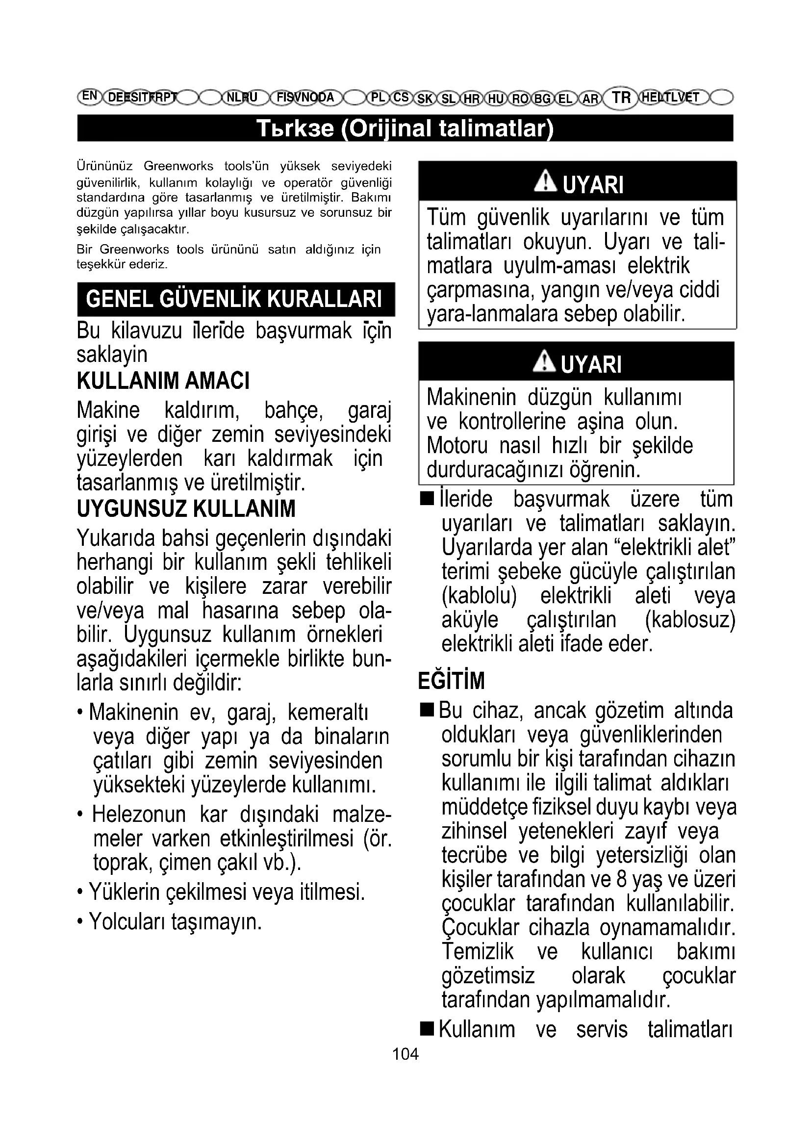 Bu cihaz, ancak gözetim altında oldukları veya güvenliklerinden sorumlu bir kişi tarafından cihazın kullanımı ile ilgili talimat aldıkları müddetçe fiziksel duyu kaybı veya zihinsel yetenekleri zayıf veya tecrübe ve bilgi yetersizliği olan kişiler tarafından ve 8 yaş ve üzeri çocuklar tarafından kullanılabilir. Çocuklar cihazla oynamamalıdır. Temizlik ve kullanıcı bakımı gözetimsiz olarak çocuklar tarafından yapılmamalıdır. Kullanım ve servis talimatları Ürününüz Greenworks tools’ün yüksek seviyedeki güvenilirlik, kullanım kolaylığı ve operatör güvenliği standardına göre tasarlanmış ve üretilmiştir. Bakımı düzgün yapılırsa yıllar boyu kusursuz ve sorunsuz bir şekilde çalışacaktır. Bir Greenworks tools ürününü satın aldığınız için teşekkür ederiz.