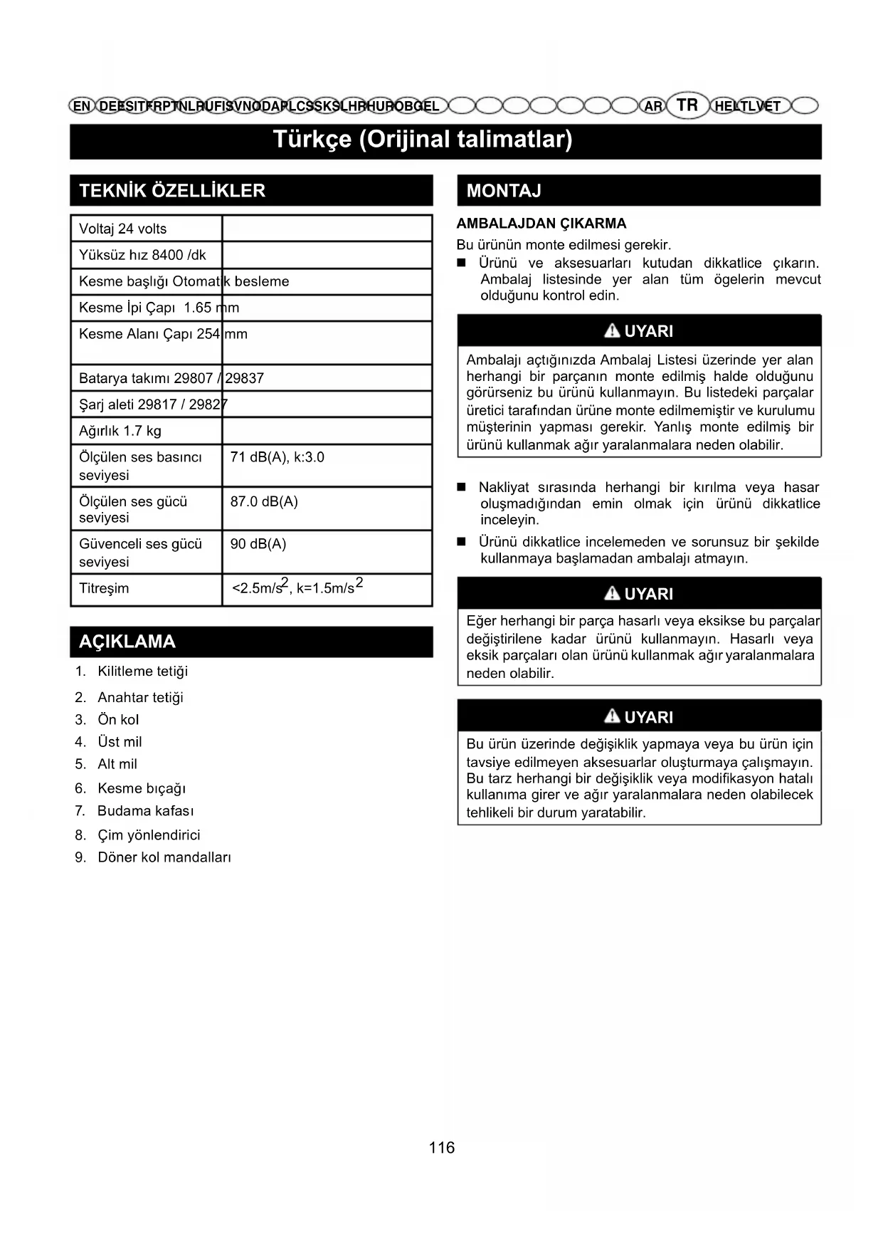 MONTAJ AMBALAJDAN ÇIKARMA Bu ürünün monte edilmesi gerekir. Ürünü ve aksesuarları kutudan dikkatlice çıkarın. Ambalaj listesinde yer alan tüm ögelerin mevcut olduğunu kontrol edin. UYARI Ambalajı açtığınızda Ambalaj Listesi üzerinde yer alan herhangi bir parçanın monte edilmiş halde olduğunu görürseniz bu ürünü kullanmayın. Bu listedeki parçalar üretici tarafından ürüne monte edilmemiştir ve kurulumu müşterinin yapması gerekir. Yanlış monte edilmiş bir ürünü kullanmak ağır yaralanmalara neden olabilir. Nakliyat sırasında herhangi bir kırılma veya hasar oluşmadığından emin olmak için ürünü dikkatlice inceleyin. Ürünü dikkatlice incelemeden ve sorunsuz bir şekilde kullanmaya başlamadan ambalajı atmayın. UYARI Eğer herhangi bir parça hasarlı veya eksikse bu parçalar değiştirilene kadar ürünü kullanmayın. Hasarlı veya eksik parçaları olan ürünü kullanmak ağır yaralanmalara neden olabilir. UYARI Bu ürün üzerinde değişiklik yapmaya veya bu ürün için tavsiye edilmeyen aksesuarlar oluşturmaya çalışmayın. Bu tarz herhangi bir değişiklik veya modikasyon hatalı kullanıma girer ve ağır yaralanmalara neden olabilecek tehlikeli bir durum yaratabilir. 116TR DE ES IT FR PT NL RU FI SV NO DA PL CS SK SL HR HU RO BG EL