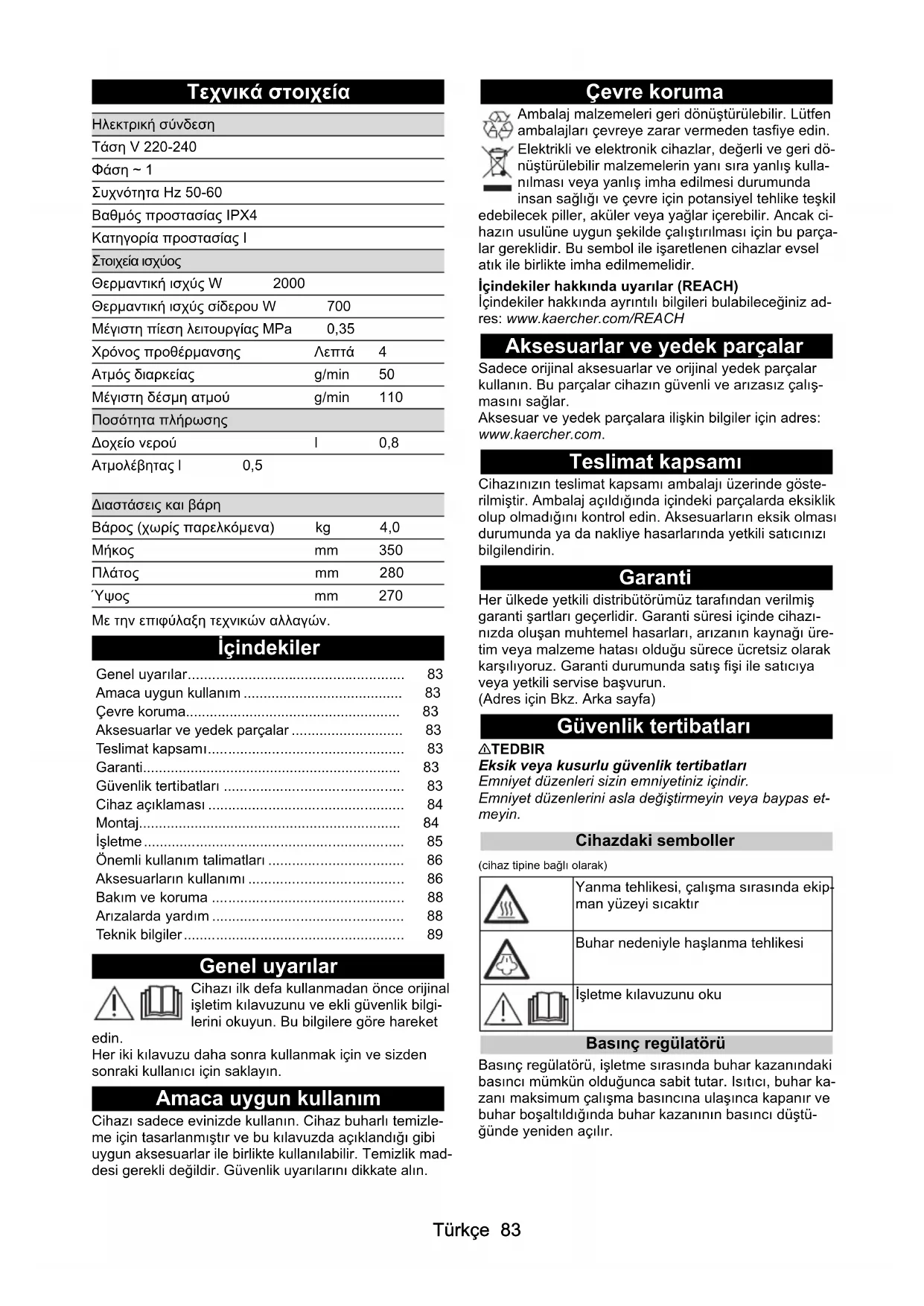- ατμοσίδερο "φτύνει" νερό Ξεπλύνετε ή αφαιρέστε τα άλατα από τον ατμολέβητα της συσκευής καθαρισμού, βλ. κεφάλαιοΑφαίρεση αλάτων ατμολέβητα. Μετά τα διαλείμματα από το σιδέρωμα, από το ατμοσίδερο εξέρχονται σταγόνες νερού Σε περίπτωση μεγάλων περιόδων αχρησίας, είναι δυνατό να υπάρξει συμπύκνωση του ατμού στους αγωγούς ατμού. Μετά από διακοπή σιδερώματος κατευθύνετε την δέσμη ατμού σε ένα πανί μέχρι ο ατμός να εξέρχεται ομοιόμορφα.Türkçe 83 Τεχνικά στοιχεία Με την επιφύλαξη τεχνικών αλλαγών. İçindekiler Genel uyarılar Cihazı ilk defa kullanmadan önce orijinal işletim kılavuzunu ve ekli güvenlik bilgi- lerini okuyun. Bu bilgilere göre hareket edin. Her iki kılavuzu daha sonra kullanmak için ve sizden sonraki kullanıcı için saklayın. Amaca uygun kullanım Cihazı sadece evinizde kullanın. Cihaz buharlı temizle- me için tasarlanmıştır ve bu kılavuzda açıklandığı gibi uygun aksesuarlar ile birlikte kullanılabilir. Temizlik mad- desi gerekli değildir. Güvenlik uyarılarını dikkate alın. Çevre koruma Ambalaj malzemeleri geri dönüştürülebilir. Lütfen ambalajları çevreye zarar vermeden tasfiye edin. Elektrikli ve elektronik cihazlar, değerli ve geri dö- nüştürülebilir malzemelerin yanı sıra yanlış kulla- nılması veya yanlış imha edilmesi durumunda insan sağlığı ve çevre için potansiyel tehlike teşkil edebilecek piller, aküler veya yağlar içerebilir. Ancak ci- hazın usulüne uygun şekilde çalıştırılması için bu parça- lar gereklidir. Bu sembol ile işaretlenen cihazlar evsel atık ile birlikte imha edilmemelidir. İçindekiler hakkında uyarılar (REACH) İçindekiler hakkında ayrıntılı bilgileri bulabileceğiniz ad- res: www.kaercher.com/REACH Aksesuarlar ve yedek parçalar Sadece orijinal aksesuarlar ve orijinal yedek parçalar kullanın. Bu parçalar cihazın güvenli ve arızasız çalış- masını sağlar. Aksesuar ve yedek parçalara ilişkin bilgiler için adres: www.kaercher.com. Teslimat kapsamı Cihazınızın teslimat kapsamı ambalajı üzerinde göste- rilmiştir. Ambalaj açıldığında içindeki parçalarda eksiklik olup olmadığını kontrol edin. Aksesuarların eksik olması durumunda ya da nakliye hasarlarında yetkili satıcınızı bilgilendirin. Garanti Her ülkede yetkili distribütörümüz tarafından verilmiş garanti şartları geçerlidir. Garanti süresi içinde cihazı- nızda oluşan muhtemel hasarları, arızanın kaynağı üre- tim veya malzeme hatası olduğu sürece ücretsiz olarak karşılıyoruz. Garanti durumunda satış fişi ile satıcıya veya yetkili servise başvurun. (Adres için Bkz. Arka sayfa) Güvenlik tertibatları 몇 TEDBIR Eksik veya kusurlu güvenlik tertibatları Emniyet düzenleri sizin emniyetiniz içindir. Emniyet düzenlerini asla değiştirmeyin veya baypas et- meyin. Cihazdaki semboller (cihaz tipine bağlı olarak) Basınç regülatörü Basınç regülatörü, işletme sırasında buhar kazanındaki basıncı mümkün olduğunca sabit tutar. Isıtıcı, buhar ka- zanı maksimum çalışma basıncına ulaşınca kapanır ve buhar boşaltıldığında buhar kazanının basıncı düştü- ğünde yeniden açılır. Ηλεκτρική σύνδεση Τάση V 220-240 Φάση ~ 1 Συχνότητα Hz 50-60 Βαθμός προστασίας IPX4 Κατηγορία προστασίας I Στοιχεία ισχύος Θερμαντική ισχύς W 2000 Θερμαντική ισχύς σίδερου W 700 Μέγιστη πίεση λειτουργίας MPa 0,35 Χρόνος προθέρμανσης Λεπτά 4 Ατμός διαρκείας g/min 50 Μέγιστη δέσμη ατμού g/min 110 Ποσότητα πλήρωσης Δοχείο νερού l 0,8 Ατμολέβητας l 0,5 Διαστάσεις και βάρη Βάρος (χωρίς παρελκόμενα) kg 4,0 Μήκος mm 350 Πλάτος mm 280 Ύψος mm 270 Genel uyarılar p. 83