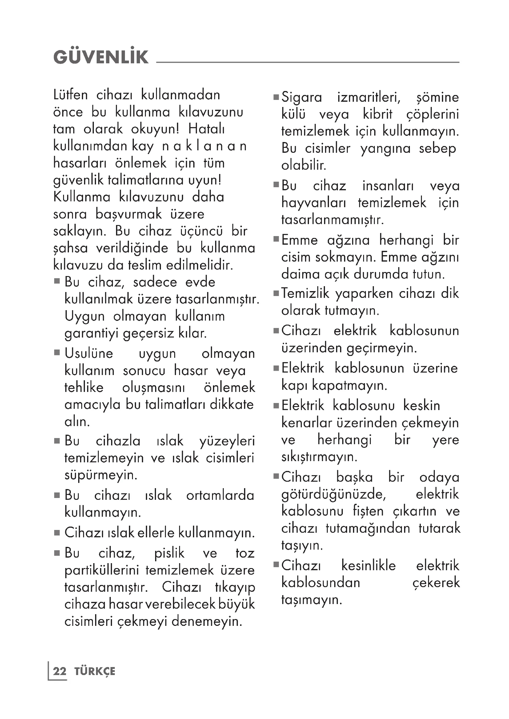 Bu cihaz, pislik ve toz partiküllerini temizlemek üzere tasarlanmıştır. Cihazı tıkayıp cihaza hasar verebilecek büyük cisimleri çekmeyi denemeyin.