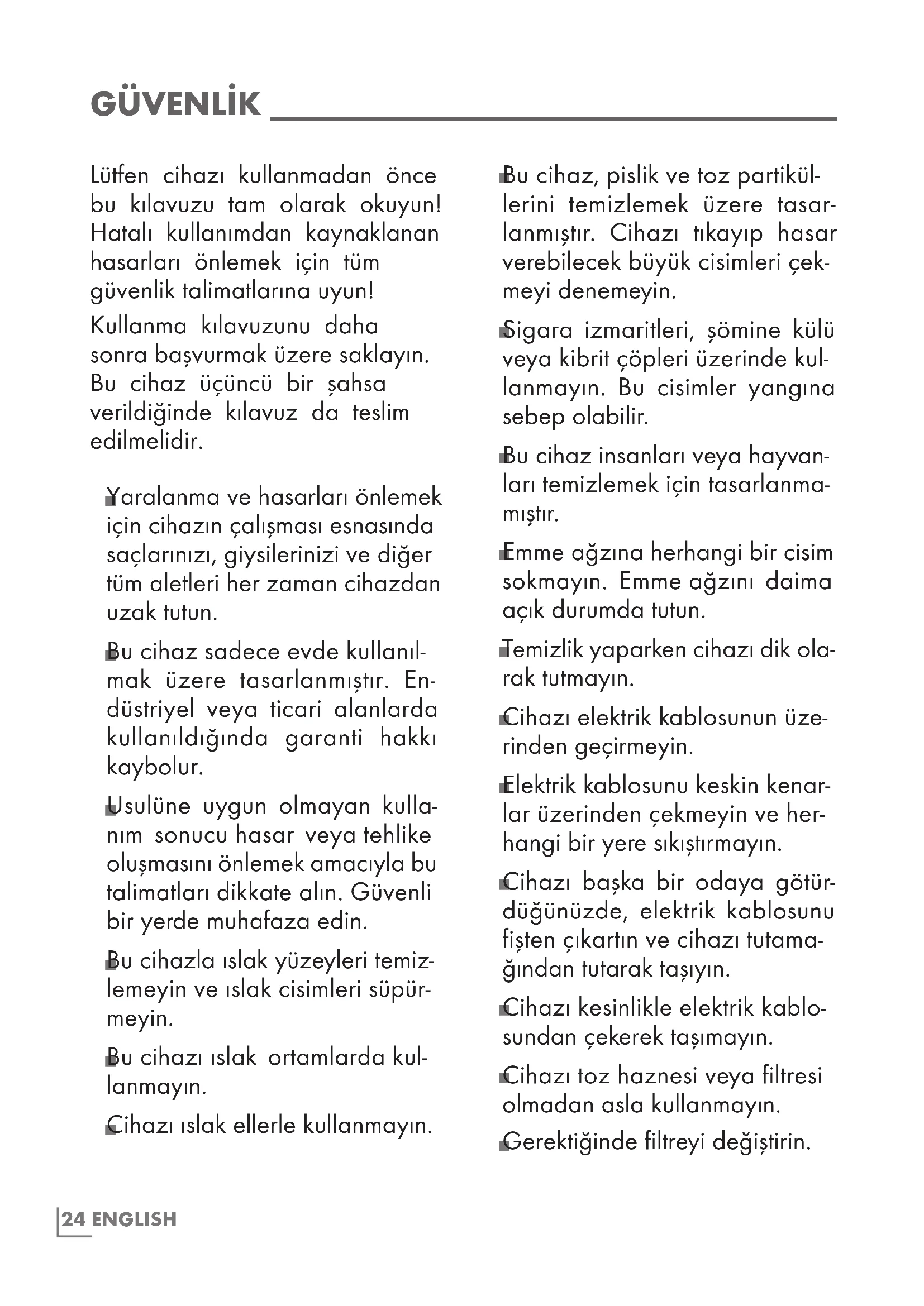 Bu cihaz, pislik ve toz partikül- lerini temizlemek üzere tasar- lanmıştır. Cihazı tıkayıp hasar verebilecek büyük cisimleri çek- meyi denemeyin.