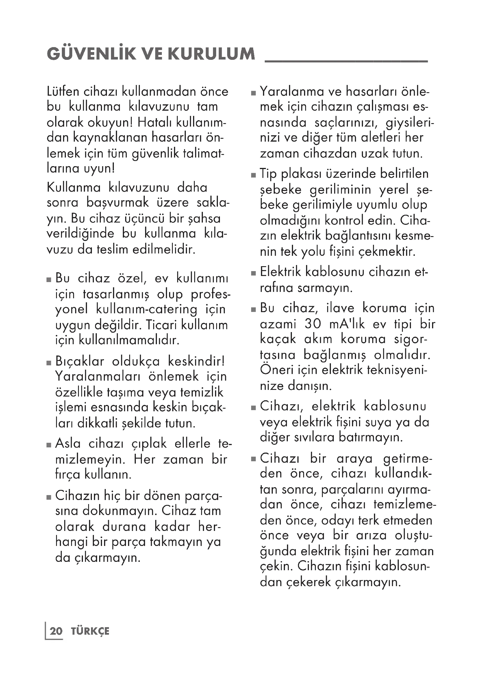 Lütfen cihazı kullanmadan önce bu kullanma kılavuzunu tam olarak okuyun! Hatalı kullanım- dan kaynaklanan hasarları ön- lemek için tüm güvenlik talimat- larına uyun! Kullanma kılavuzunu daha sonra başvurmak üzere sakla- yın. Bu cihaz üçüncü bir şahsa verildiğinde bu kullanma kıla- vuzu da teslim edilmelidir.