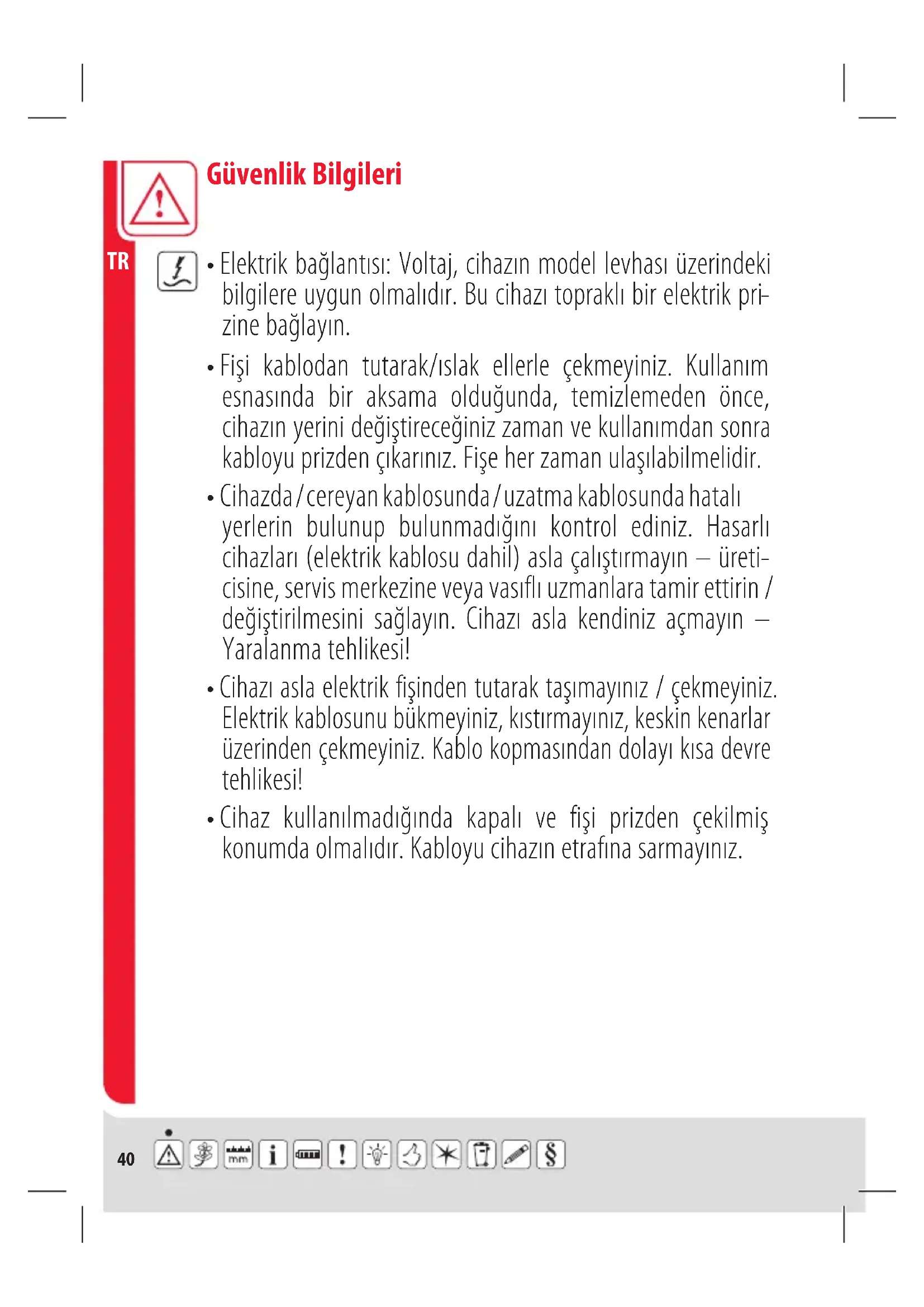 - Cihazı asla elektrik fişinden tutarak taşımayınız / çekmeyiniz. Elektrik kablosunu bükmeyiniz, kıstırmayınız, keskin kenarlar üzerinden çekmeyiniz. Kablo kopmasından dolayı kısa devre tehlikesi! Güvenlik Bilgileri