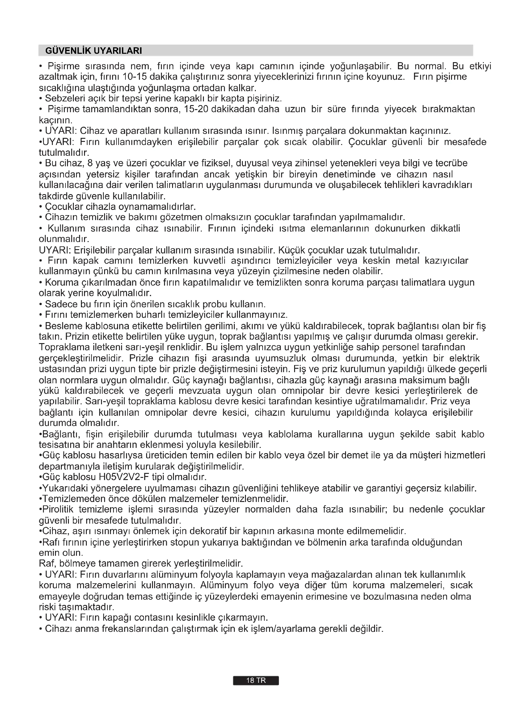 - Güç kablosu H05V2V2-F tipi olmalıdır.