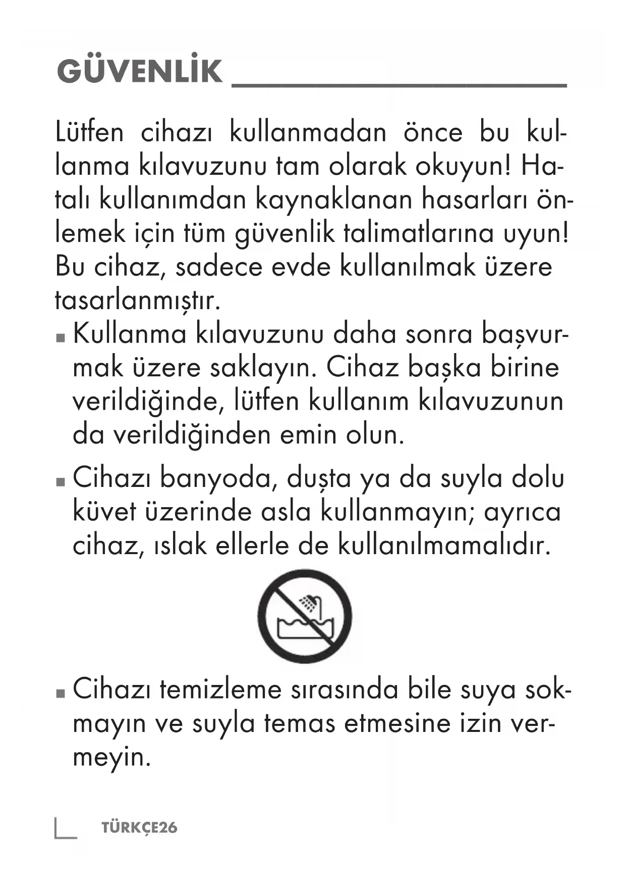 Lütfen cihazı kullanmadan önce bu kul- lanma kılavuzunu tam olarak okuyun! Ha- talı kullanımdan kaynaklanan hasarları ön- lemek için tüm güvenlik talimatlarına uyun! Bu cihaz, sadece evde kullanılmak üzere tasarlanmıştır.