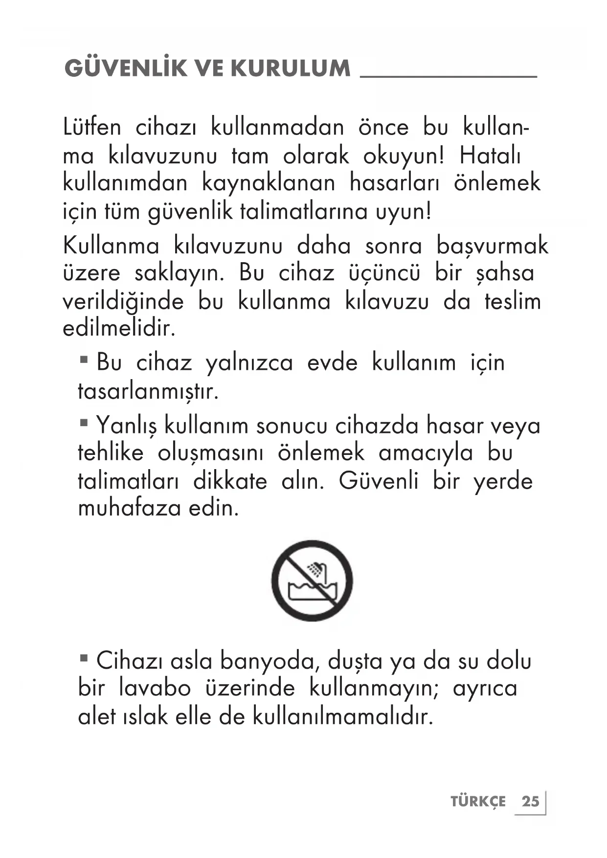 - Cihazı asla banyoda, duşta ya da su dolu bir lavabo üzerinde kullanmayın; ayrıca alet ıslak elle de kullanılmamalıdır.26