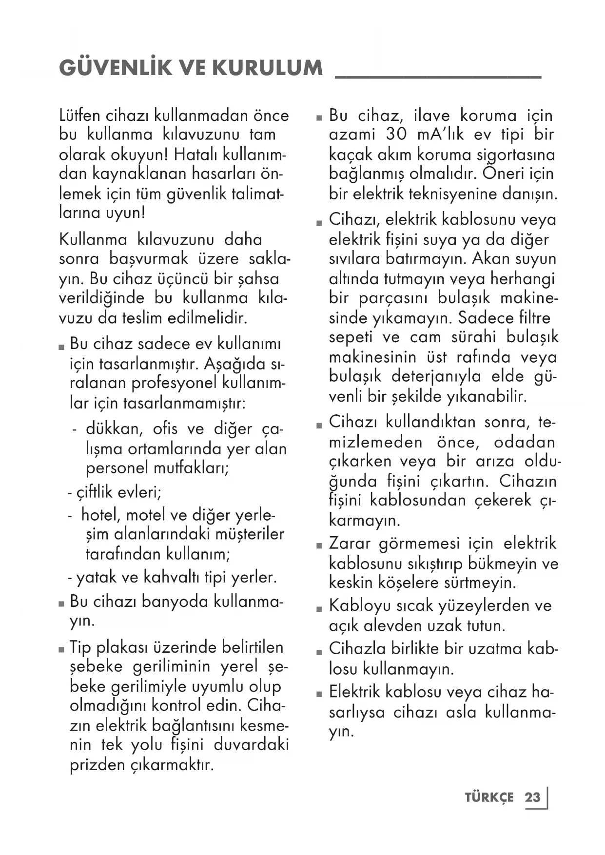 Cihazı, elektrik kablosunu veya elektrik fişini suya ya da diğer sıvılara batırmayın. Akan suyun altında tutmayın veya herhangi bir parçasını bulaşık makine- sinde yıkamayın. Sadece filtre sepeti ve cam sürahi bulaşık makinesinin üst rafında veya bulaşık deterjanıyla elde gü- venli bir şekilde yıkanabilir.