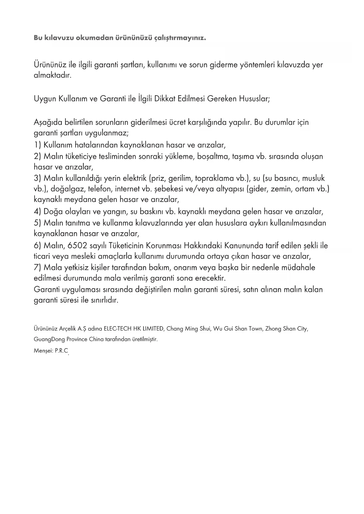 edilmesi durumunda mala verilmiş garanti sona erecektir. Garanti uygulaması sırasında değiştirilen malın garanti süresi, satın alınan malın kalan garanti süresi ile sınırlıdır. Ürününüz Arçelik A.Ş adına ELEC-TECH HK LIMITED, Chang Ming Shui, Wu Gui Shan Town, Zhong Shan City, GuangDong Province China tarafından üretilmiştir. Menşei: P.R.C