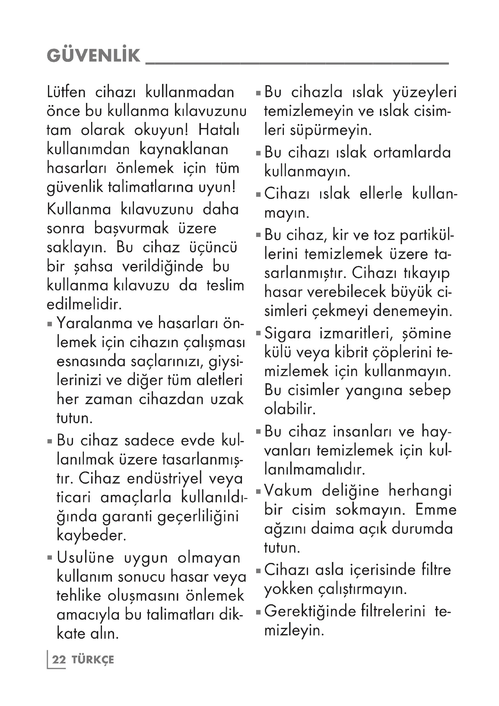 Lütfen cihazı kullanmadan önce bu kullanma kılavuzunu tam olarak okuyun! Hatalı kullanımdan kaynaklanan hasarları önlemek için tüm güvenlik talimatlarına uyun! Kullanma kılavuzunu daha sonra başvurmak üzere saklayın. Bu cihaz üçüncü bir şahsa verildiğinde bu kullanma kılavuzu da teslim edilmelidir.