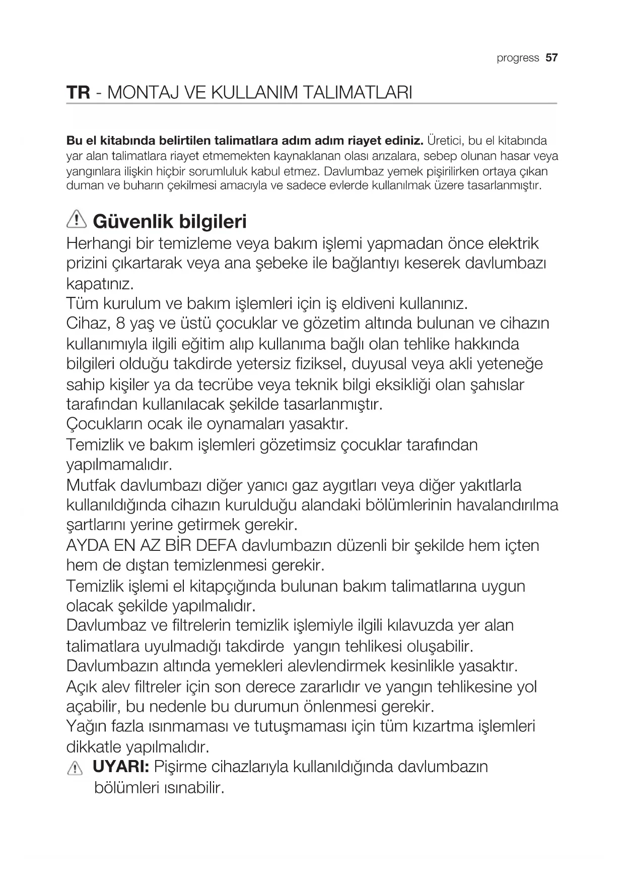 Bu el kitabında belirtilen talimatlara adım adım riayet ediniz. Üretici, bu el kitabında yar alan talimatlara riayet etmemekten kaynaklanan olası arızalara, sebep olunan hasar veya yangınlara ilişkin hiçbir sorumluluk kabul etmez. Davlumbaz yemek pişirilirken ortaya çıkan duman ve buharın çekilmesi amacıyla ve sadece evlerde kullanılmak üzere tasarlanmıştır. Güvenlik bilgileri Herhangi bir temizleme veya bakım işlemi yapmadan önce elektrik prizini çıkartarak veya ana şebeke ile bağlantıyı keserek davlumbazı kapatınız. Tüm kurulum ve bakım işlemleri için iş eldiveni kullanınız. Cihaz, 8 yaş ve üstü çocuklar ve gözetim altında bulunan ve cihazın kullanımıyla ilgili eğitim alıp kullanıma bağlı olan tehlike hakkında bilgileri olduğu takdirde yetersiz fiziksel, duyusal veya akli yeteneğe sahip kişiler ya da tecrübe veya teknik bilgi eksikliği olan şahıslar tarafından kullanılacak şekilde tasarlanmıştır. Çocukların ocak ile oynamaları yasaktır. Temizlik ve bakım işlemleri gözetimsiz çocuklar tarafından yapılmamalıdır. Mutfak davlumbazı diğer yanıcı gaz aygıtları veya diğer yakıtlarla kullanıldığında cihazın kurulduğu alandaki bölümlerinin havalandırılma şartlarını yerine getirmek gerekir. AYDA EN AZ BİR DEFA davlumbazın düzenli bir şekilde hem içten hem de dıştan temizlenmesi gerekir. Temizlik işlemi el kitapçığında bulunan bakım talimatlarına uygun olacak şekilde yapılmalıdır. Davlumbaz ve filtrelerin temizlik işlemiyle ilgili kılavuzda yer alan talimatlara uyulmadığı takdirde yangın tehlikesi oluşabilir. Davlumbazın altında yemekleri alevlendirmek kesinlikle yasaktır. Açık alev filtreler için son derece zararlıdır ve yangın tehlikesine yol açabilir, bu nedenle bu durumun önlenmesi gerekir. Yağın fazla ısınmaması ve tutuşmaması için tüm kızartma işlemleri dikkatle yapılmalıdır. UYARI: Pişirme cihazlarıyla kullanıldığında davlumbazın bölümleri ısınabilir.58 progress Güvenlik talimatlari Ampul değiştirirken kılavuzda bulunan ampul Bakım/Değiştirme bölümünde yer alan lamba tipini kullanınız. DİKKAT! Kurulum işlemini tamamlamadan cihazın ana bağlantısını yapmayınız. Buhar tahliyesi için uygulanacak teknik ve güvenlik önlemleriyle ilgili olarak yerel yönetim tarafından verilen düzenlemelere uymak önemlidir. Bu cihaz için gaz veya diğer yakıt kullanan cihazlardan buhar tahliye etmek gibi farklı nedenlerden dolayı kullanılan vantilasyon sistemine kanal sistemi kurulmamalıdır. Elektrik çarpma risklerini önlemek için davlumbaz ampulunu doğru şekilde yerleştirmeden cihazı kullanmayınız. Izgaraları kurmadan davlumbazı kullanmayınız. Özellikle belirtilmediği takdirde davlumbazı ASLA destek yüzeyi olarak kullanmayınız. Montaj için ürünle tedarik edilen vidaları kullanınız veya, tedarik edilmediği takdirde, uygun vida tipini satın alınız. Kurulum Kılavuzunda yer alan doğru uzunluktaki vidaları kullanınız. Tüm sorularınız için yetkili destek hizmetini veya uzman teknisyen ile irtibata geçiniz. DİKKAT! Kılavuzda yer alan talimatlara uygun şekilde vida ve sabitleme aygıtlarının yerleştirilmemesi elektriksel tehlikelere neden olabilir. Çevreyle ilgili bilgiler Şu sembole sahip malzemeler geri dönüştürülebilir . Ambalajı geri dönüşüm için uygun konteynerlere koyun. Elektrikli ve elektronik cihaz atıklarının geri dönüşümüne ve çevre ve insan sağlığının korunmasına yardımcı olun. Ev atığı sembolü bulunan cihazları atmayın. Ürünü yerel geri dönüşüm tesislerinize gönderin ya da belediye ile irtibata geçin. AEEE yönetmeliğine uygundur. Kullanım Davlumbaz dışarı tahliye yapan aspiratör versiyonunda , yada dahilde devir daimli filtre eden versiyonunda kullanılmalıdır. Kurulum Ana güç kaynağı davlumbazın içinde yer alan plakada belirtilen değere uygun olmalıdır. Davlumbazı varsa bir fiş ile mevcut düzenlemelere uygun bir prize takıp erişilebilir bir alana yerleştiriniz. Kurulumdan sonra da eğer cihazın fişi yok ise (doğrudan şebeke bağlantısı) veya priz erişilebilir bir yerde değilse, aşırı akım kategorisi III ile ilgili koşullar altında ana kablonun bağlantısının tamamen kesilmesini sağlayan, standartlara uygun çift kutuplu bir anahtar kullanın. Uyarı!Davlumbazı ana güç kaynağına yeniden bağlamadan ve etkin şekilde çalıştığını kontrol etmeden önce, ana güç kaynağı kablosunun düzgün takılıp takılmadığını denetleyin.progress 59 Ocağın üzerindeki pişirme kapları için destek yüzeyleri ile ocak davlumbazının en alçak kısmı arasındaki minimum mesafe, elektrikli ısıtıcılardan 45 cm, gaz veya gazla elektrikle çalışan ocaklardan 55 cm’den az olmamalıdır. Gazlı ocakların kurulumuyla ilgili olarak talimatlarda daha fazla mesafe belirtiliyorsa, buna bağlı kalınmalıdır. Bakim DİKKAT! Herhangi bir bakım işlemini gerçekleştirmeden önce, davlumbazı elektrik şebekesinden ayırınız. Cihaz bir fiş ve soketle bağlı ise, fiş prizden çekilmelidir. Davlumbazın içi ve dışı düzenli olarak (en az yağ filtrelerinin bakımı için gerçekleştirdiğiniz sıklıkta) temizlenmelidir. Ilık suya batırılmış bir bez ve nötr sıvı deterjanla temizleyiniz. Aşındırıcı ürünler kullanmayınız. ALKOL KULLANMAYINIZ! Uyarı! Davlumbaza ilişkin temel temizleme talimatlarının yerine getirilmemesi ve filtrelerin değiştirilmemesi yangına neden olabilir. Bu nedenle, söz konusu talimatlara uymanızı öneririz. Üretici, uygun olmayan bakımdan veya yukarıda belirtilen güvenlik tavsiyelerine uymamaktan kaynaklanan motor veya yangın hasarı konusunda sorumluluk kabul etmez. Yağ ltresi Yağ filtresi, ayda bir asitsiz deterjanla, elde veya düşük ısı ve kısa devreye programlanmış bir bulaşık makinesinde temizlenmelidir. B