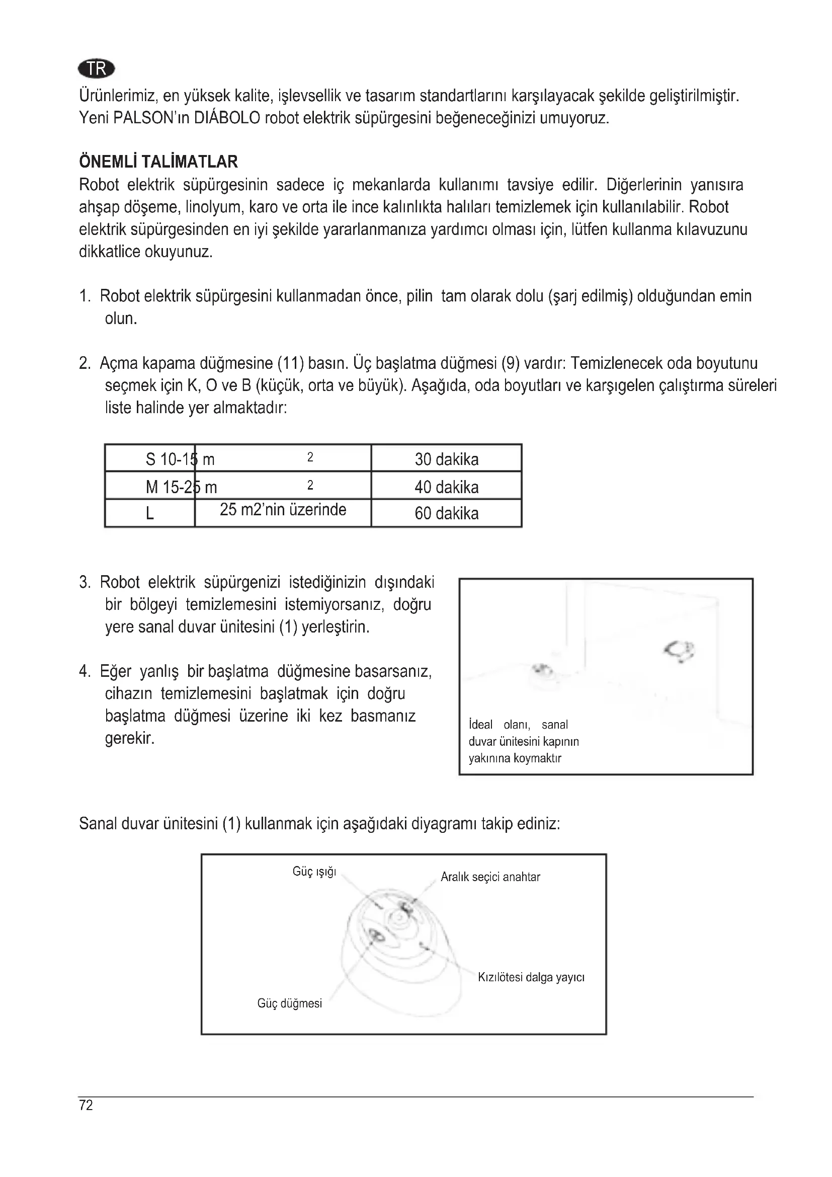 UYARI: Robot elektrikli supurgeyi kullanmadan once, temizlik esnasindo duşmesi muhtemel kaplari,;küçuk kutulari ve benzerlerinin onun yolu üzerinden kaldirin.