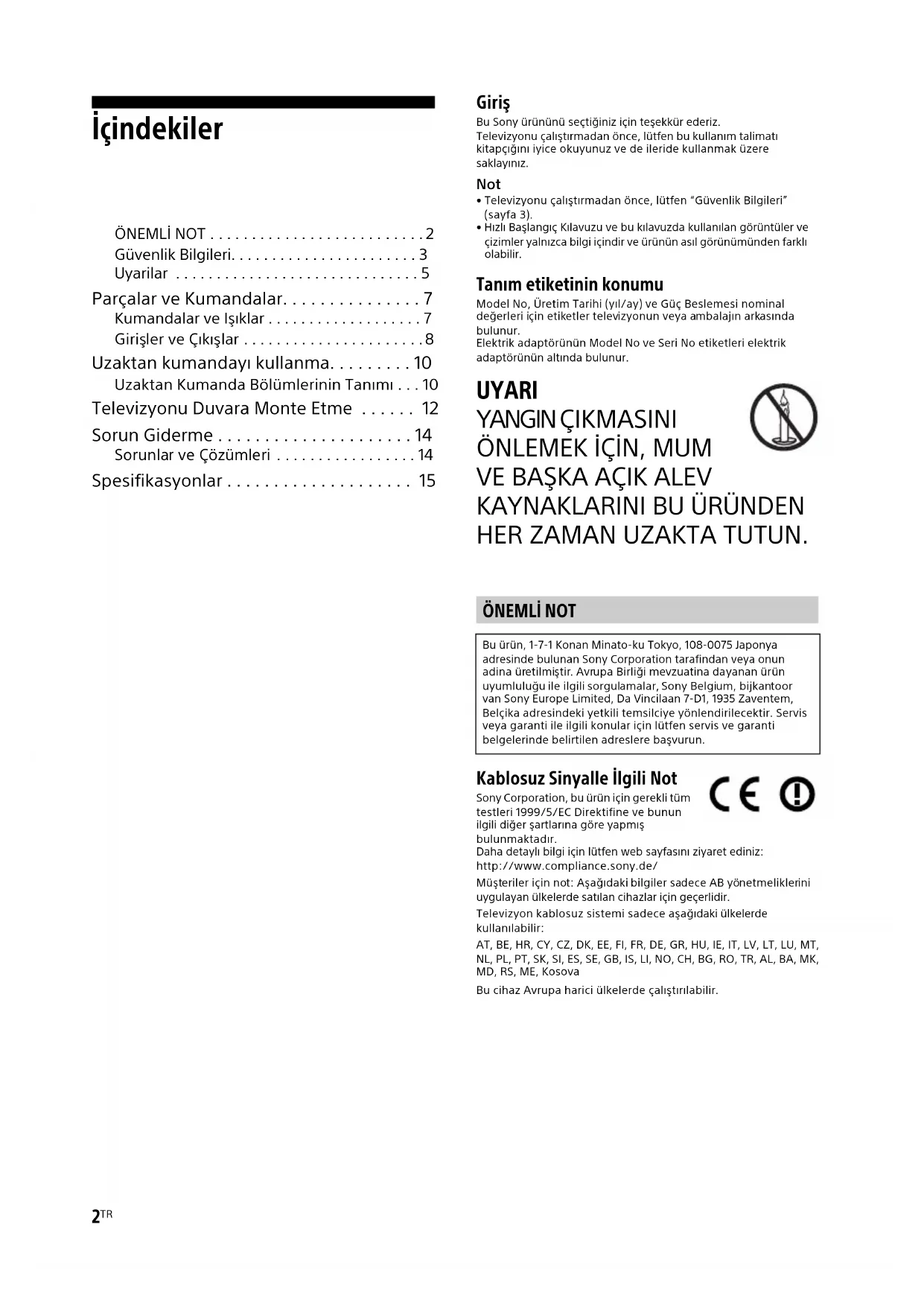 HER ZAMAN UZAKTA TUTUN. Kablosuz Sinyalle İlgili Not Sony Corporation, bu ürün için gerekli tüm testleri 1999/5/EC Direktifine ve bunun ilgili diğer şartlarına göre yapmış bulunmaktadır.Daha detaylı bilgi için lütfen web sayfasını ziyaret ediniz:http://www.compliance.sony.de/ Müşteriler için not: Aşağıdaki bilgiler sadece AB yönetmeliklerini uygulayan ülkelerde satılan cihazlar için geçerlidir.Televizyon kablosuz sistemi sadece aşağıdaki ülkelerde kullanılabilir:AT, BE, HR, CY, CZ, DK, EE, FI, FR, DE, GR, HU, IE, IT, LV, LT, LU, MT, NL, PL, PT, SK, SI, ES, SE, GB, IS, LI, NO, CH, BG, RO, TR, AL, BA, MK, MD, RS, ME, KosovaBu cihaz Avrupa harici ülkelerde çalıştırılabilir. ÖNEMLİ NOT Bu ürün, 1-7-1 Konan Minato-ku Tokyo, 108-0075 Japonya adresinde bulunan Sony Corporation tarafindan veya onun adina üretilmiştir. Avrupa Birliği mevzuatina dayanan ürün uyumluluğu ile ilgili sorgulamalar, Sony Belgium, bijkantoor van Sony Europe Limited, Da Vincilaan 7-D1, 1935 Zaventem, Belçika adresindeki yetkili temsilciye yönlendirilecektir. Servis veya garanti ile ilgili konular için lütfen servis ve garanti belgelerinde belirtilen adreslere başvurun.GB