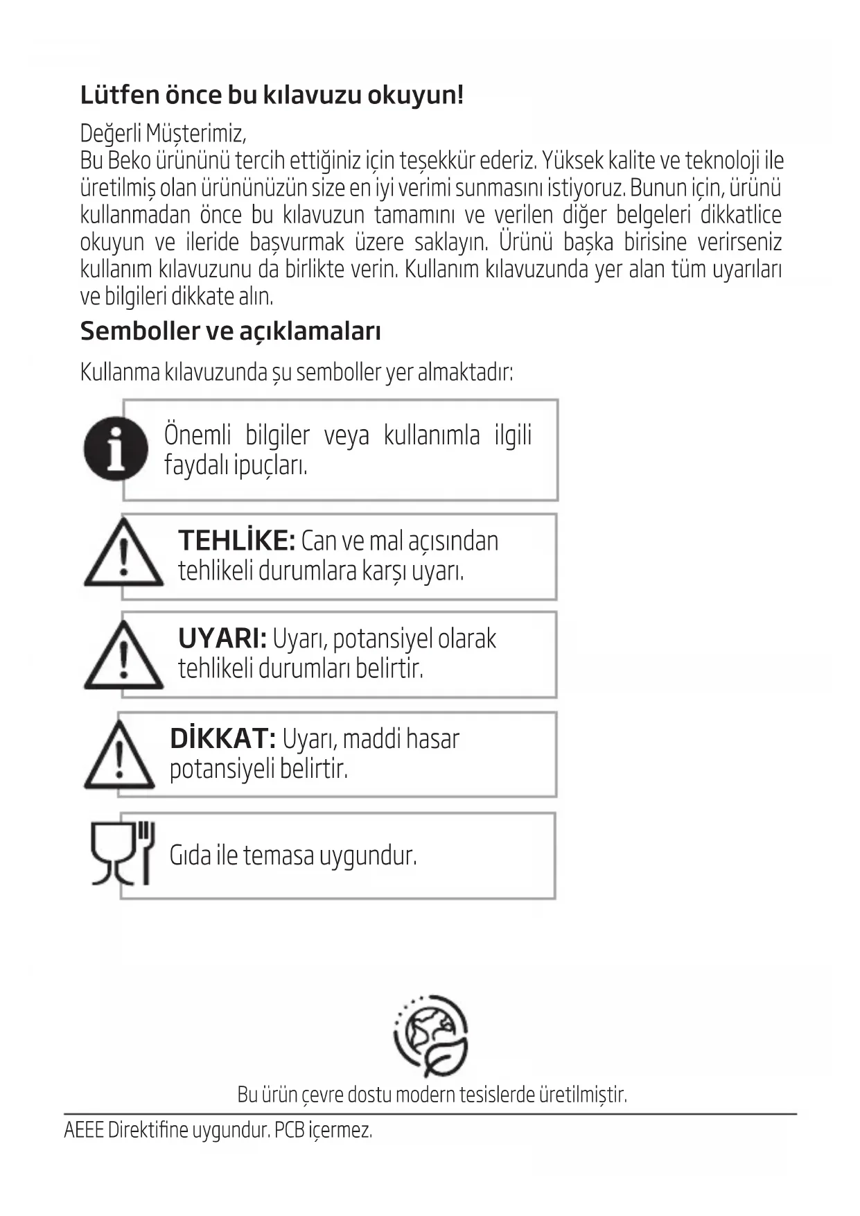 DépannageLütfen önce bu kılavuzu okuyun! Değerli Müşterimiz, Bu Beko ürününü tercih ettiğiniz için teşekkür ederiz. Yüksek kalite ve teknoloji ile üretilmiş olan ürününüzün size en iyi verimi sunmasını istiyoruz. Bunun için, ürünü kullanmadan önce bu kılavuzun tamamını ve verilen diğer belgeleri dikkatlice okuyun ve ileride başvurmak üzere saklayın. Ürünü başka birisine verirseniz kullanım kılavuzunu da birlikte verin. Kullanım kılavuzunda yer alan tüm uyarıları ve bilgileri dikkate alın. Semboller ve açıklamaları Kullanma kılavuzunda şu semboller yer almaktadır: Öneml blgler veya kullanımla lgl faydalı puçları. TEHLİKE: Can ve mal açısından tehlkel durumlara karşı uyarı. UYARI: Uyarı, potansyel olarak tehlkel durumları belrtr. DİKKAT: Uyarı, madd hasar potansyel belrtr. Gıda le temasa uygundur. Bu ürün çevre dostu modern tesislerde üretilmiştir. AEEE Direktine uygundur. PCB içermez.1. Dış Damlama Tepsisi